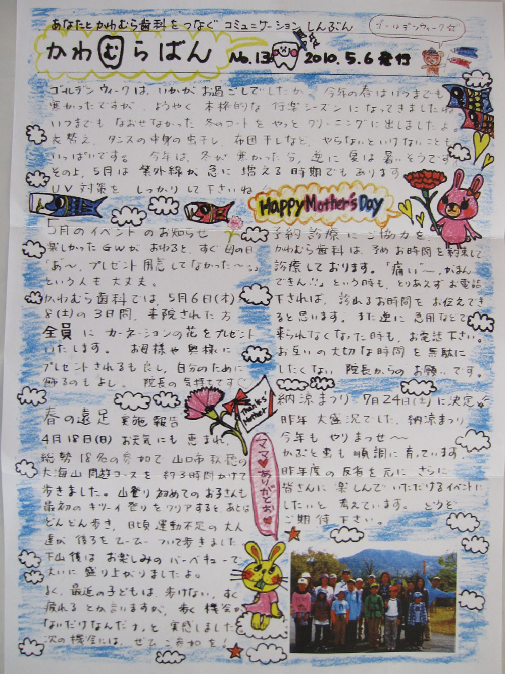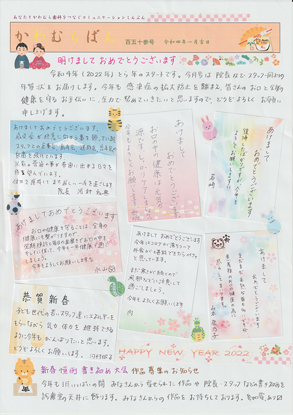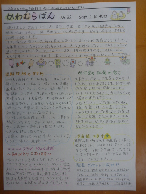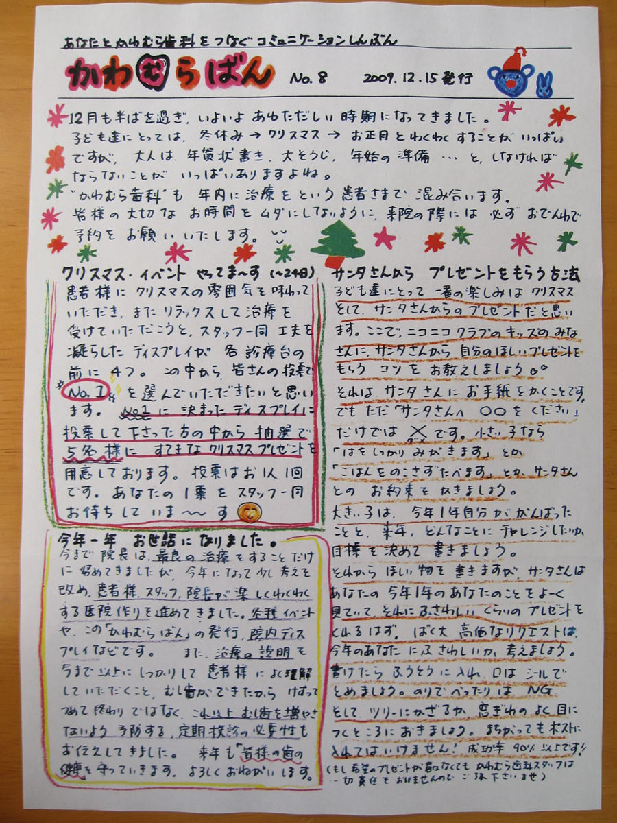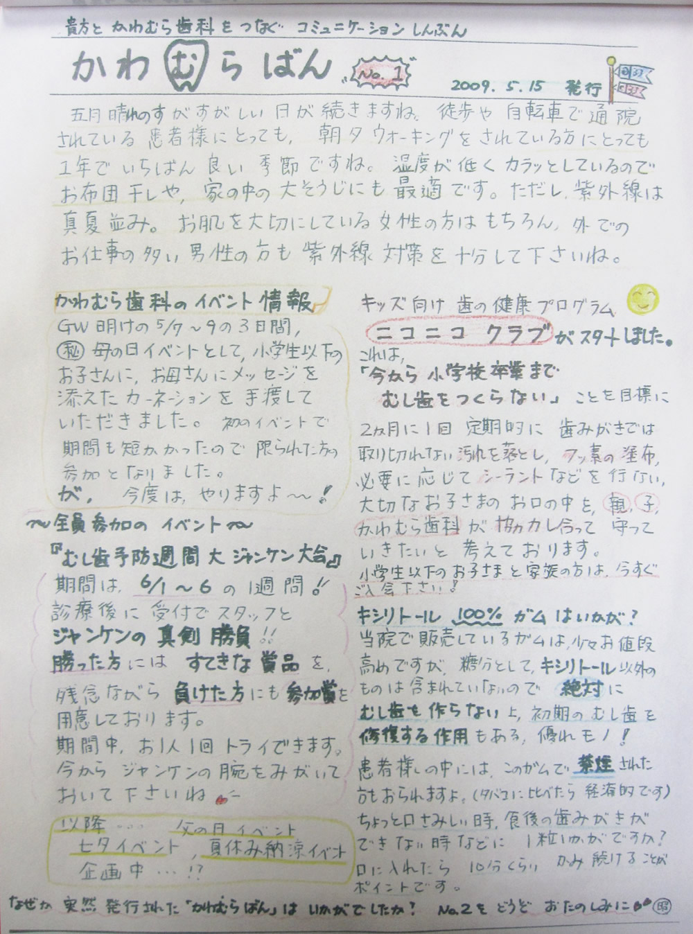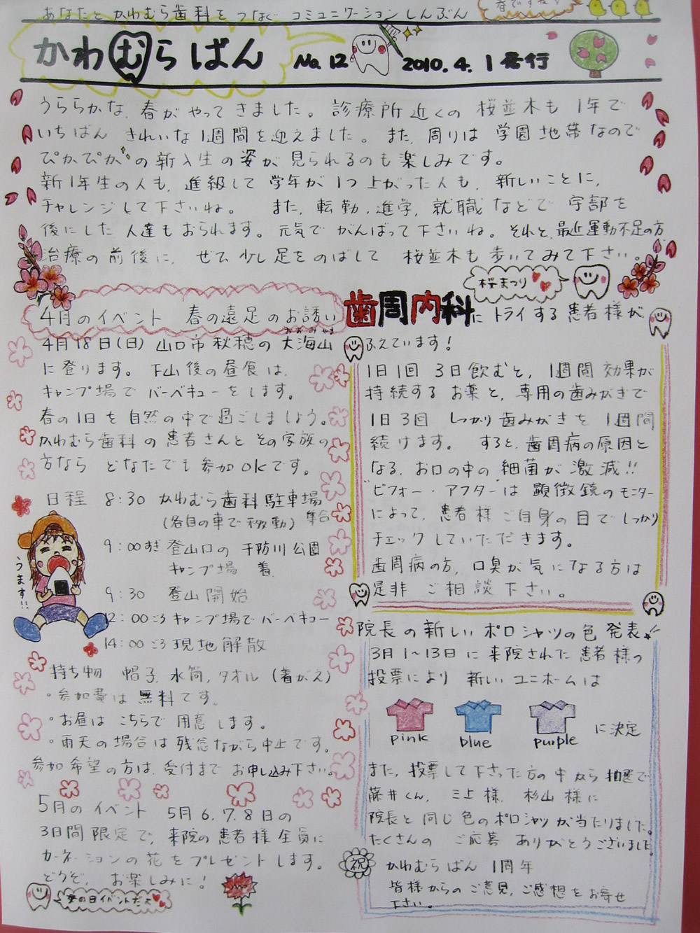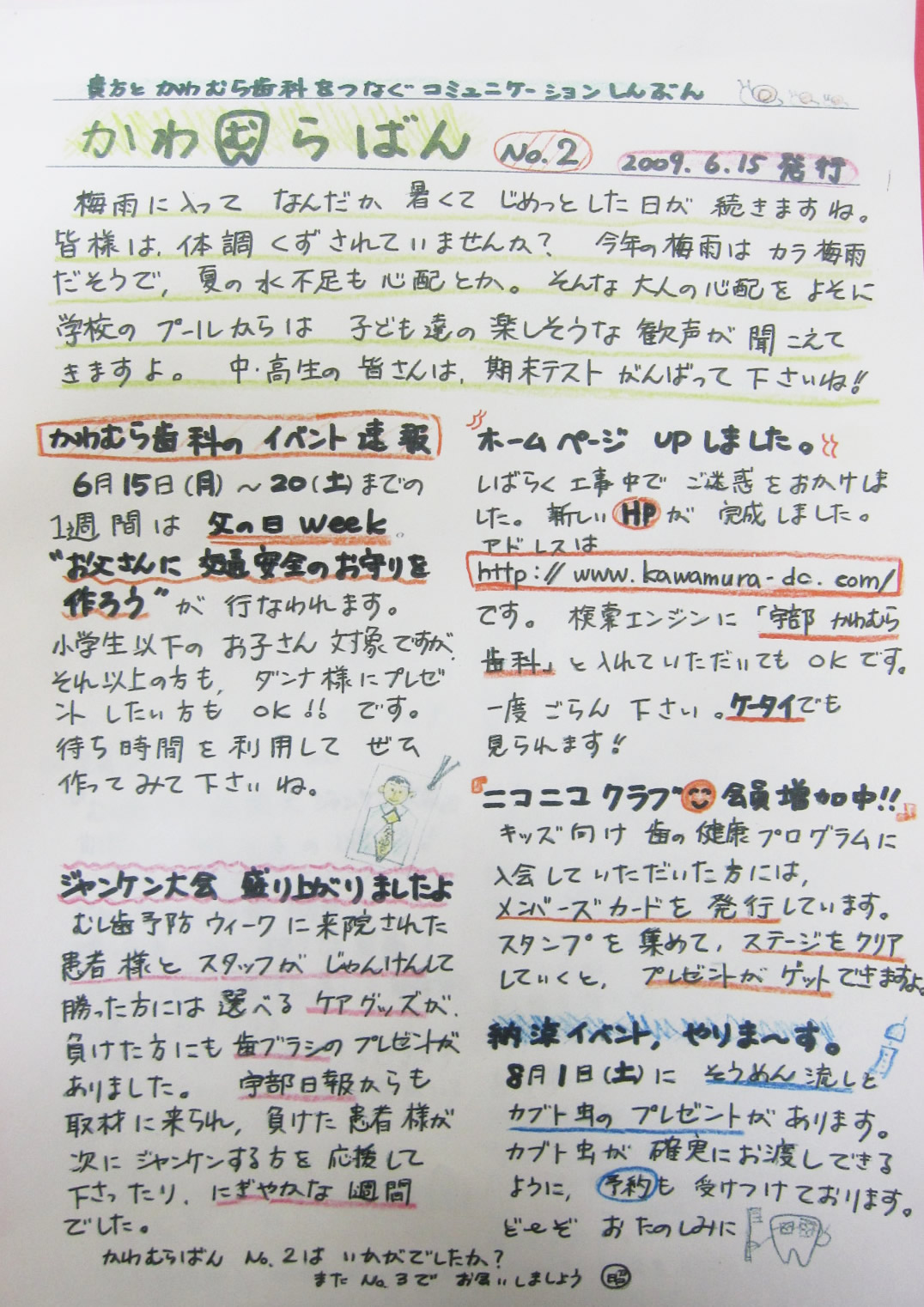 かわむら歯科医院では、院内新聞「かわむら版」を発行しています。 患者さまと医院をつなぐ架け橋として、スタッフが一生懸命に取り組んでいる新聞です。 歯科に関することに限らず、当院の様子、院長の近況など、幅広く、皆様に情報を発信させて頂きたいと思います。 ご意見など、お待ちしております。 毎号ともホームページでもご案内していきますので、是非ご覧下さい。