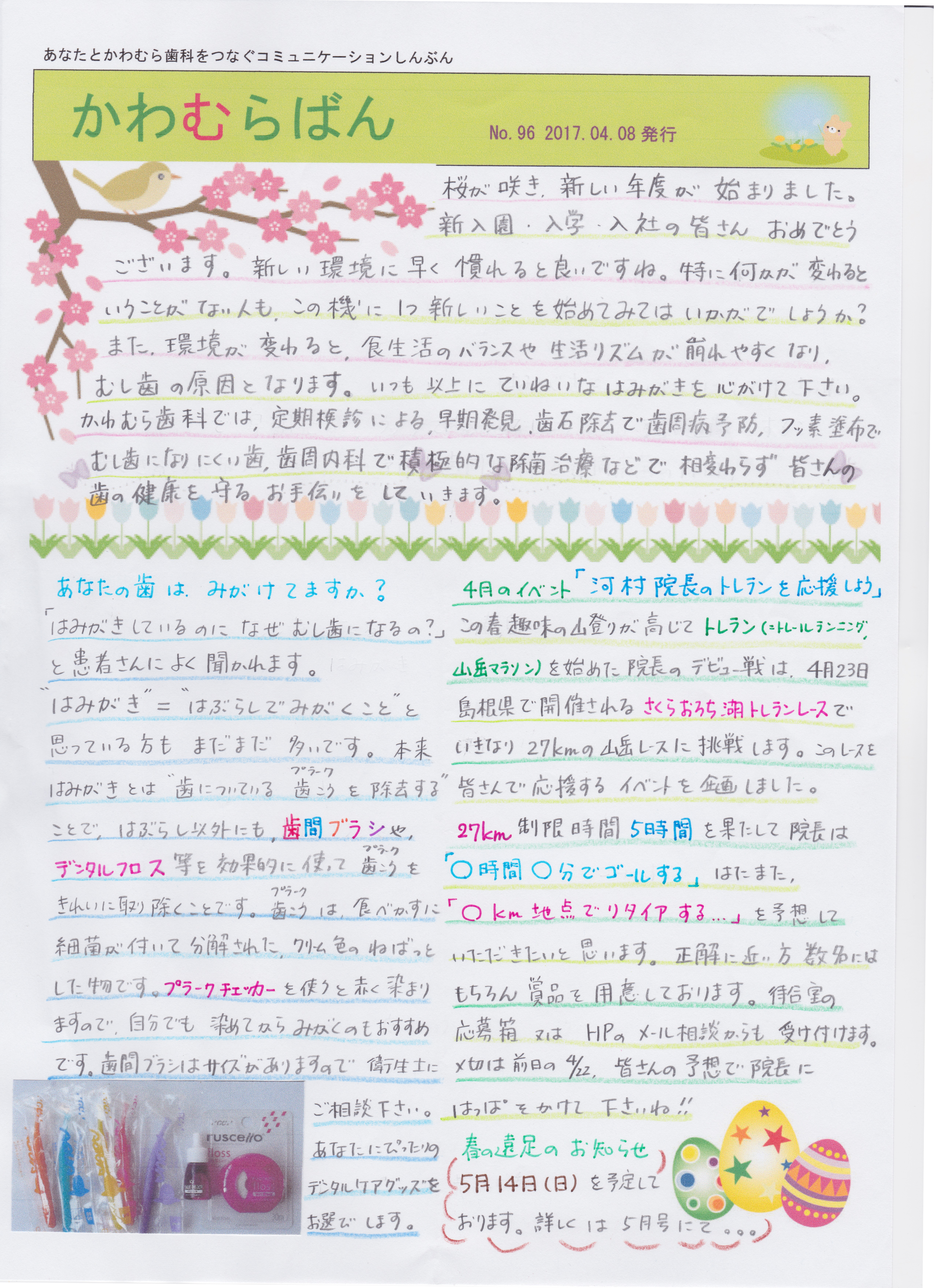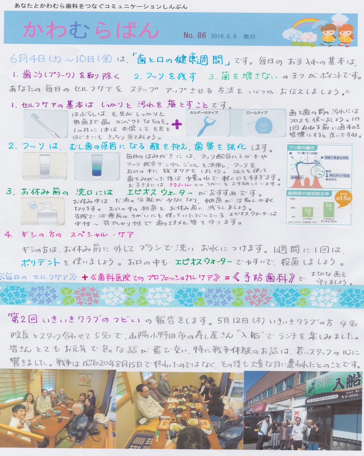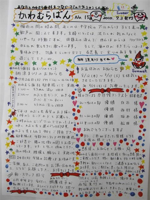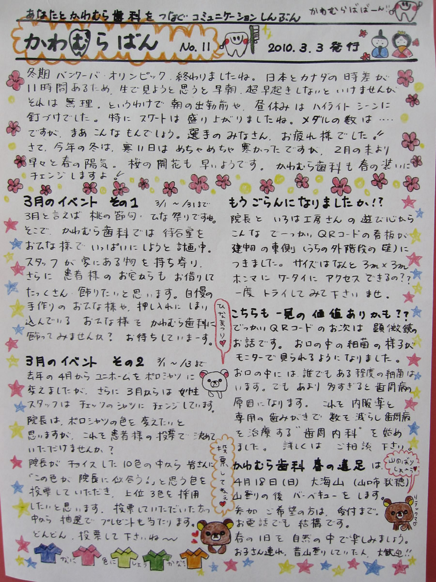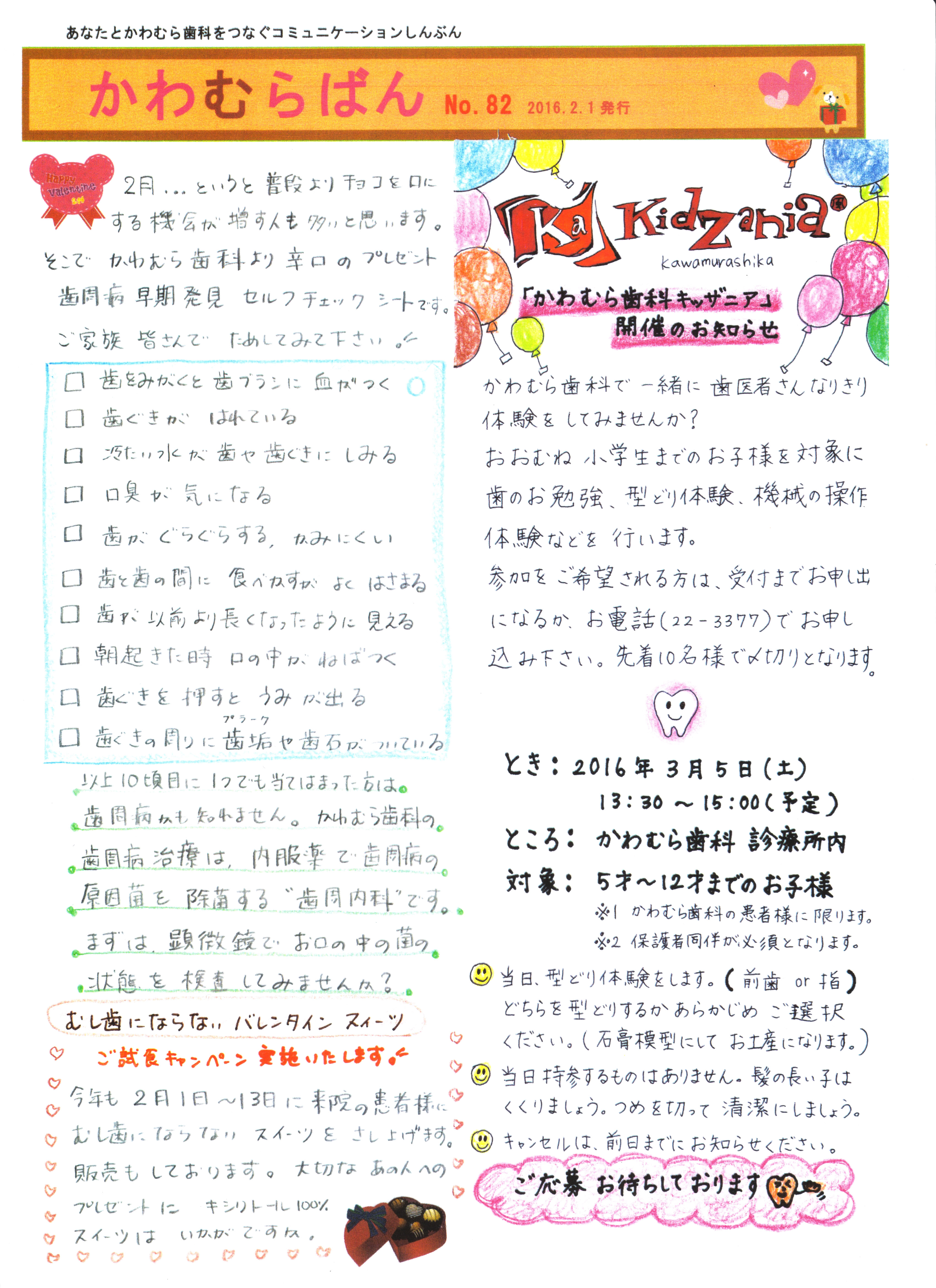 かわむら歯科医院では、院内新聞「かわむら版」を発行しています。 患者さまと医院をつなぐ架け橋として、スタッフが一生懸命に取り組んでいる新聞です。 歯科に関することに限らず、当院の様子、院長の近況など、幅広く、皆様に情報を発信させて頂きたいと思います。 ご意見など、お待ちしております。 毎号ともホームページでもご案内していきますので、是非ご覧下さい。