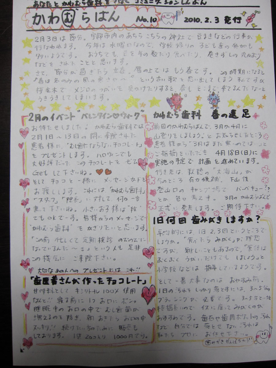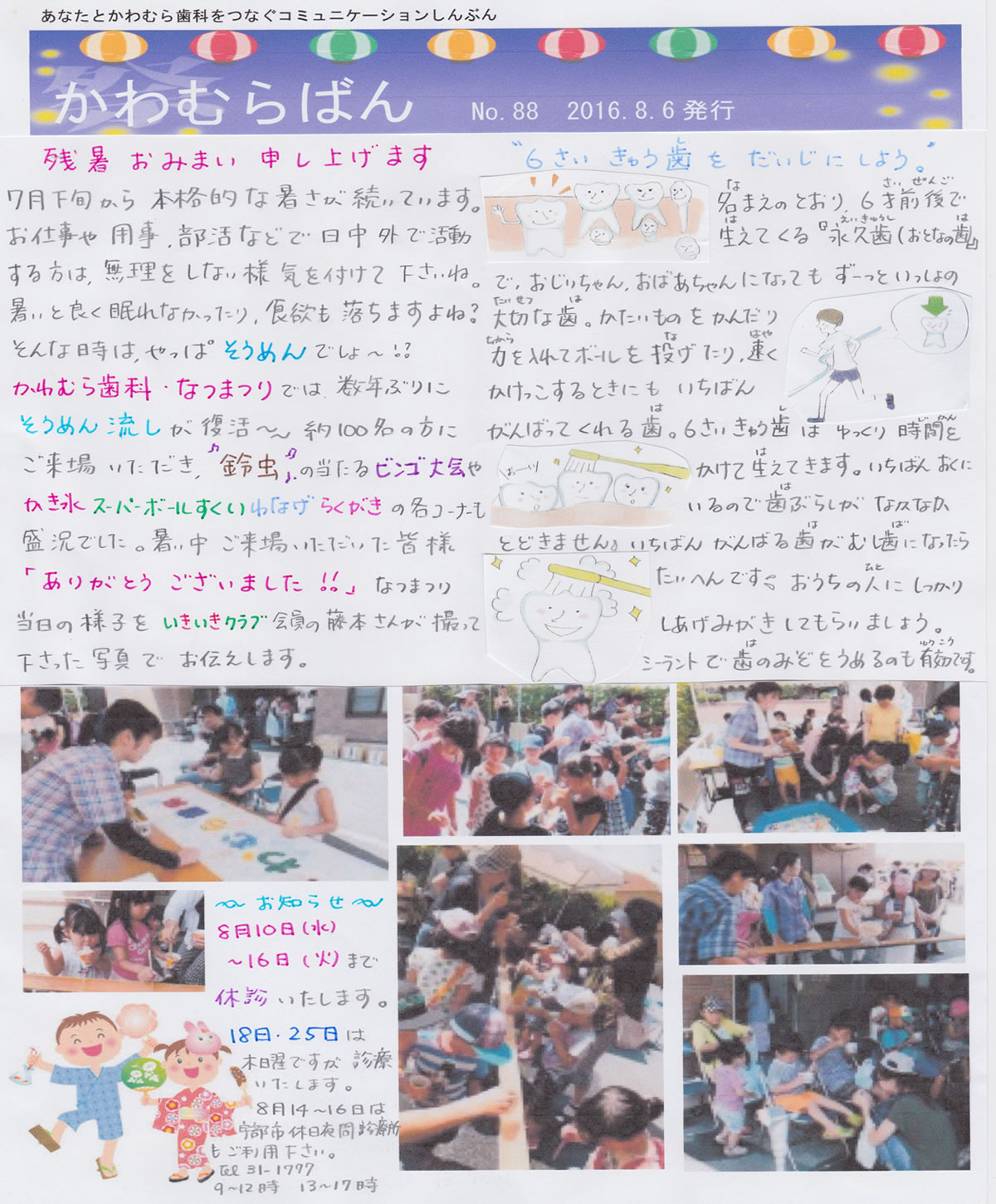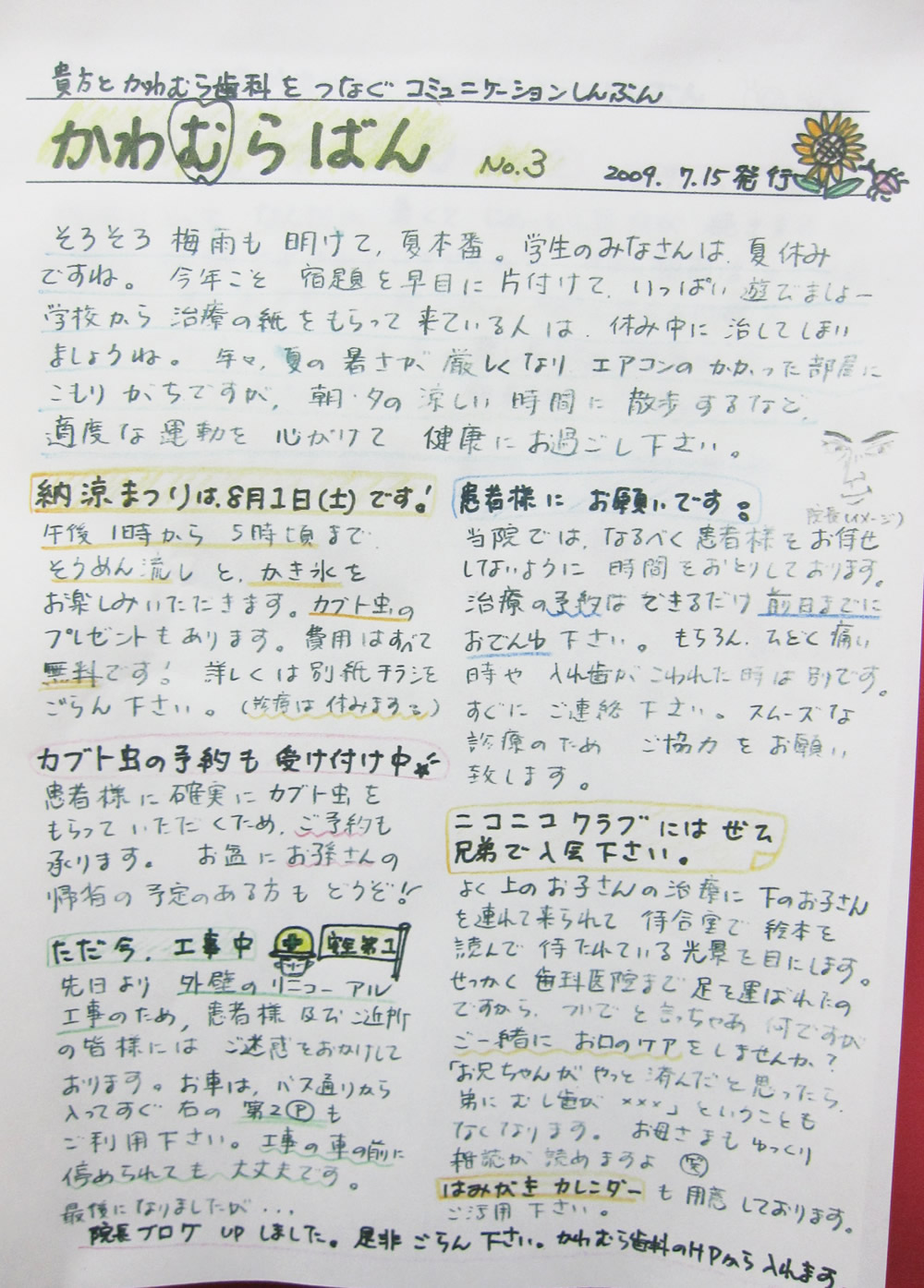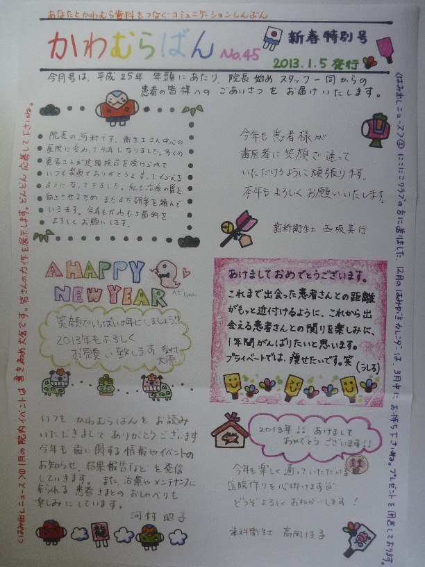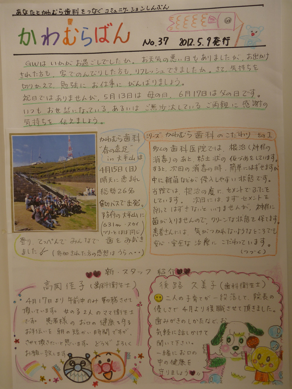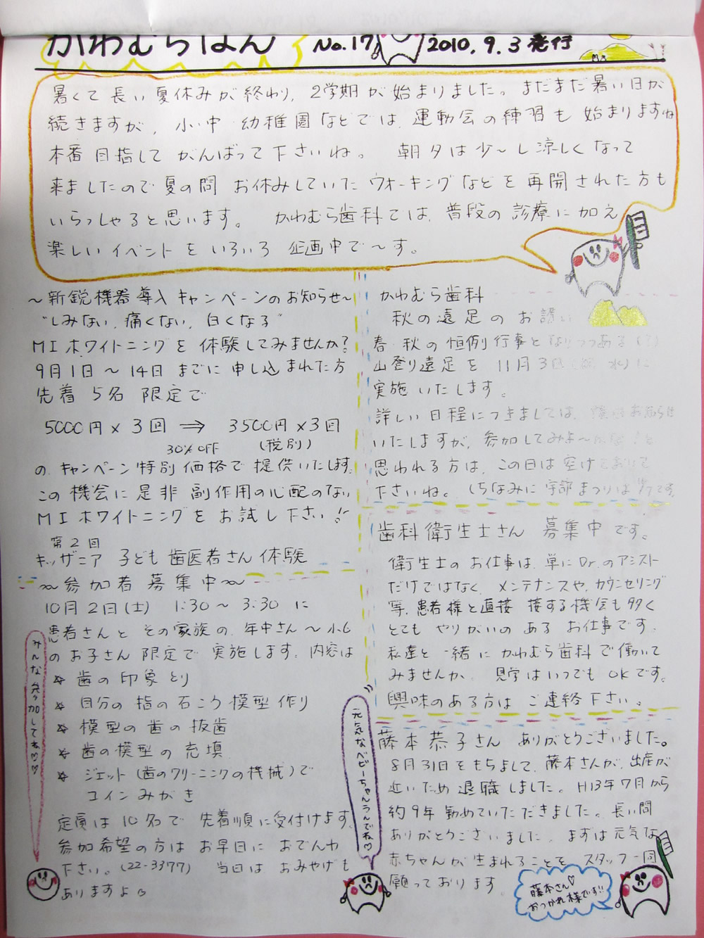 かわむら歯科医院では、院内新聞「かわむら版」を発行しています。 患者さまと医院をつなぐ架け橋として、スタッフが一生懸命に取り組んでいる新聞です。 歯科に関することに限らず、当院の様子、院長の近況など、幅広く、皆様に情報を発信させて頂きたいと思います。 ご意見など、お待ちしております。 毎号ともホームページでもご案内していきますので、是非ご覧下さい。