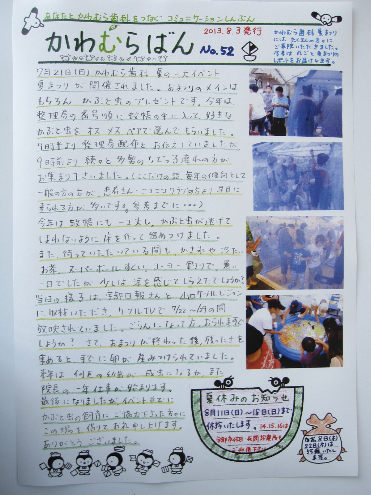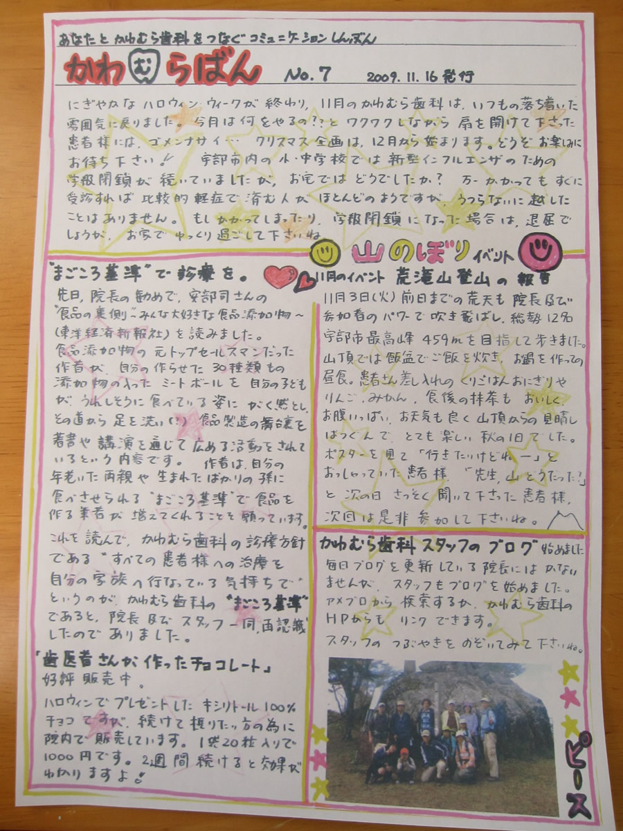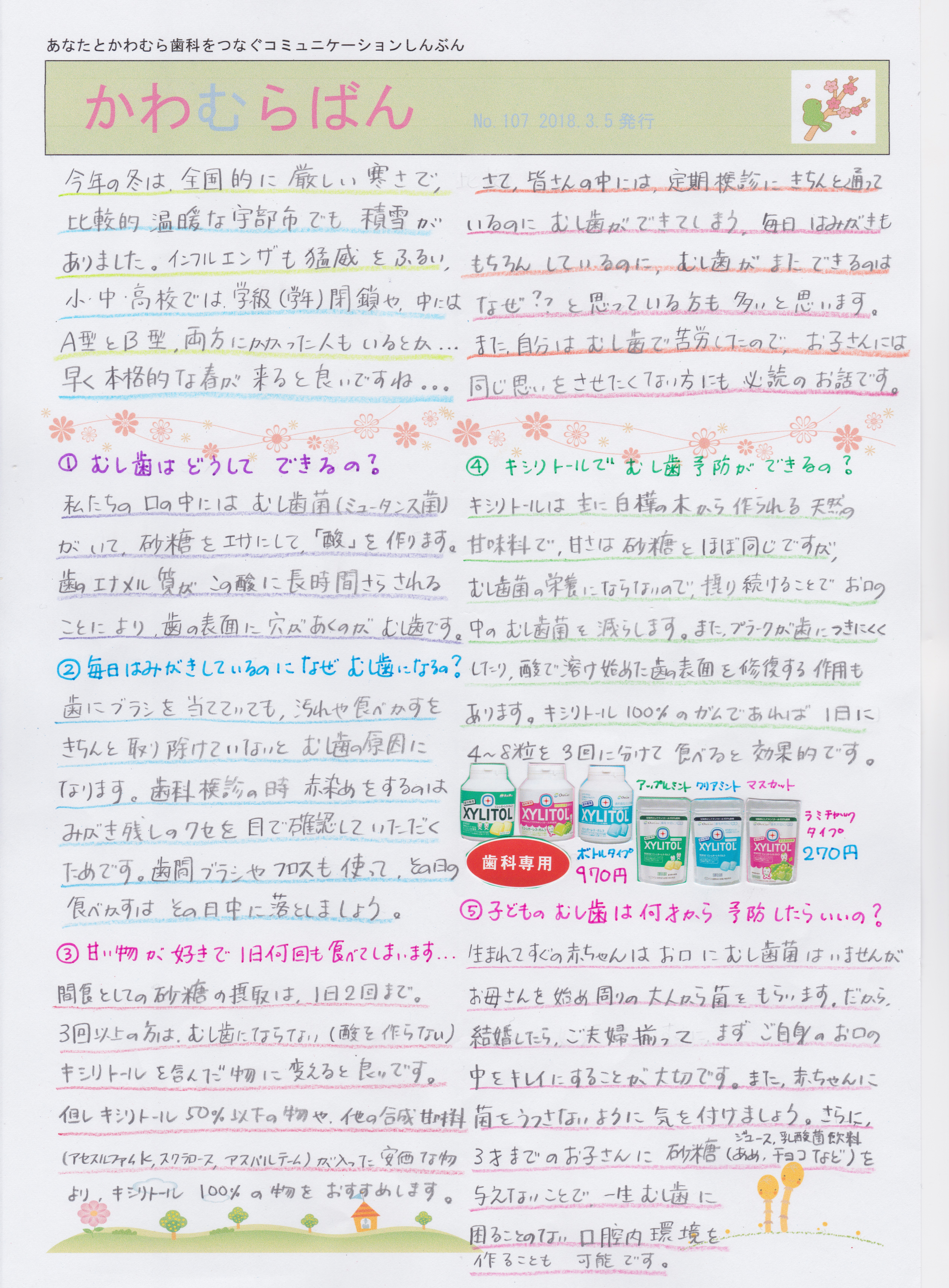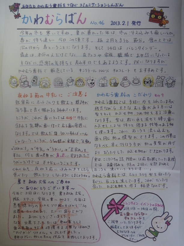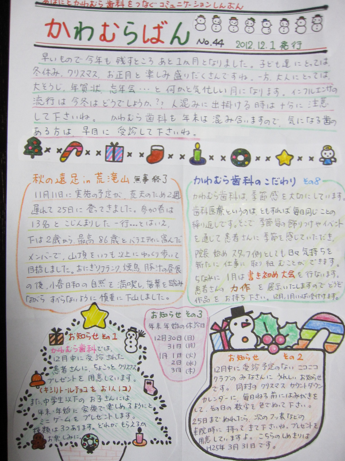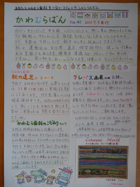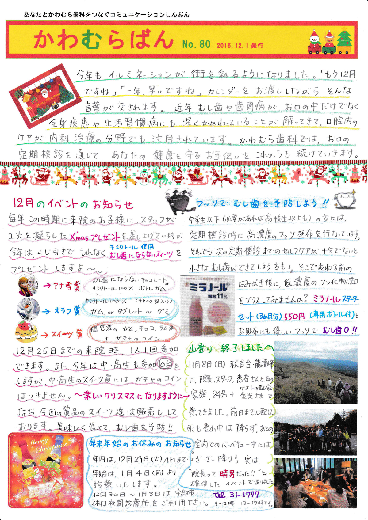 かわむら歯科医院では、院内新聞「かわむら版」を発行しています。 患者さまと医院をつなぐ架け橋として、スタッフが一生懸命に取り組んでいる新聞です。 歯科に関することに限らず、当院の様子、院長の近況など、幅広く、皆様に情報を発信させて頂きたいと思います。 ご意見など、お待ちしております。 毎号ともホームページでもご案内していきますので、是非ご覧下さい。