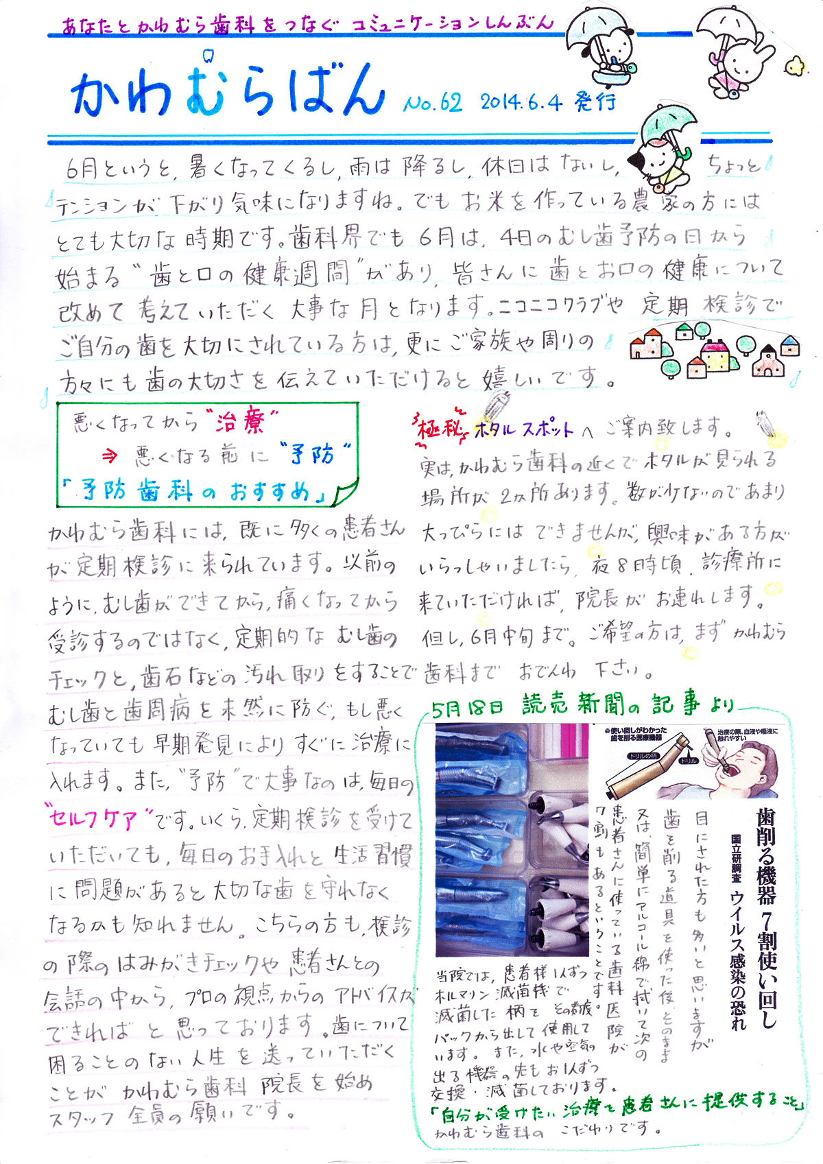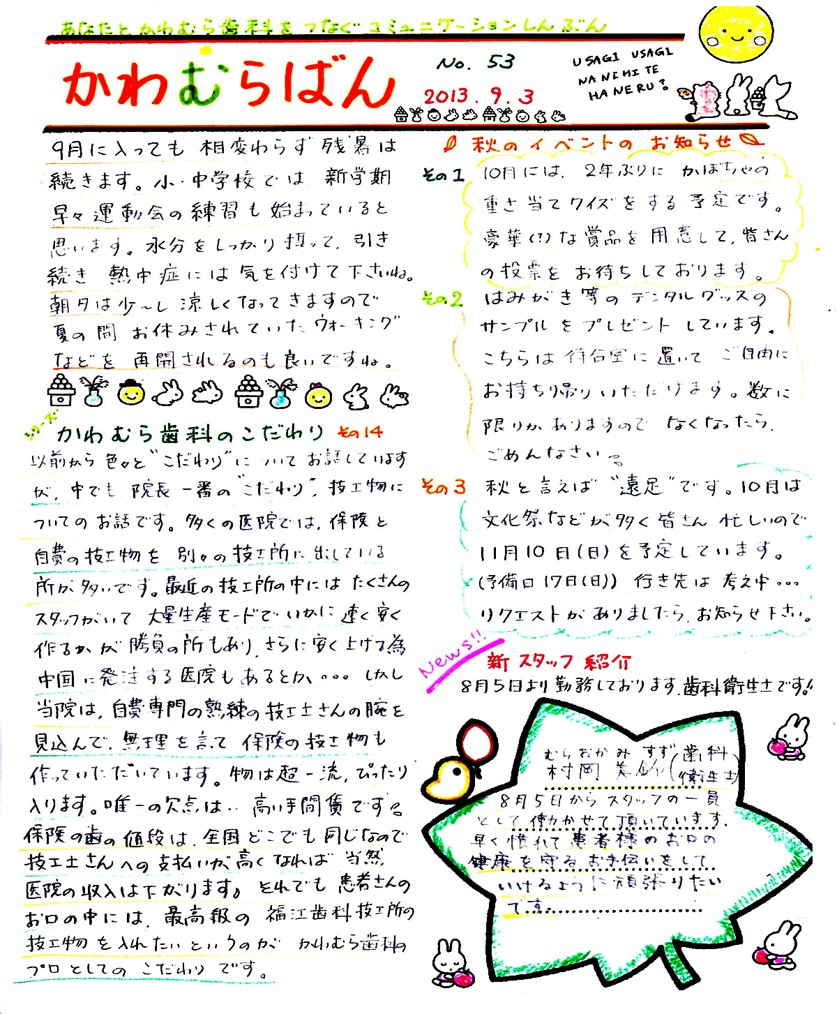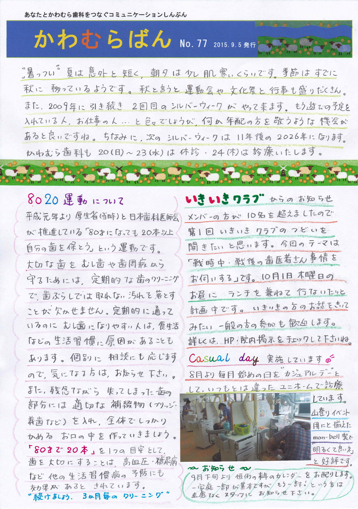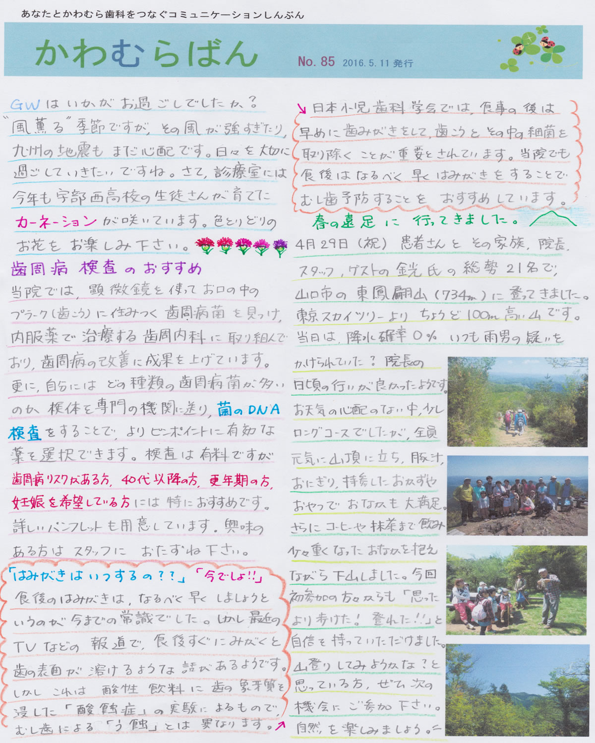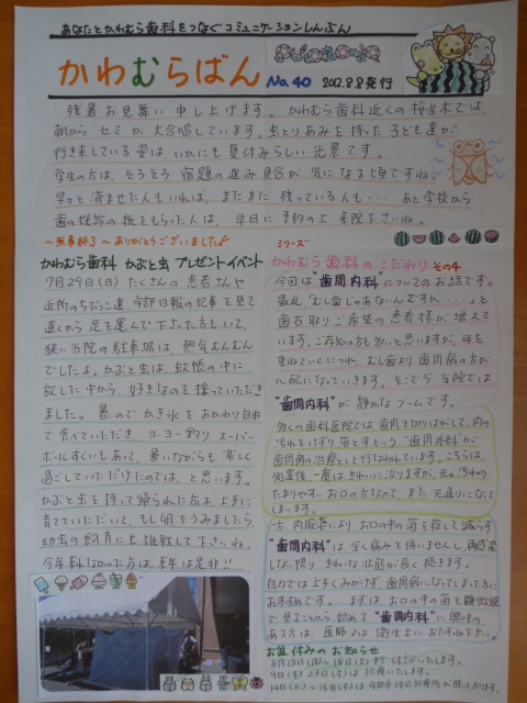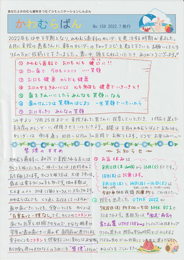 かわむら歯科医院では、院内新聞「かわむら版」を発行しています。 患者さまと医院をつなぐ架け橋として、スタッフが一生懸命に取り組んでいる新聞です。 歯科に関することに限らず、当院の様子、院長の近況など、幅広く、皆様に情報を発信させて頂きたいと思います。 ご意見など、お待ちしております。 毎号ともホームページでもご案内していきますので、是非ご覧下さい。