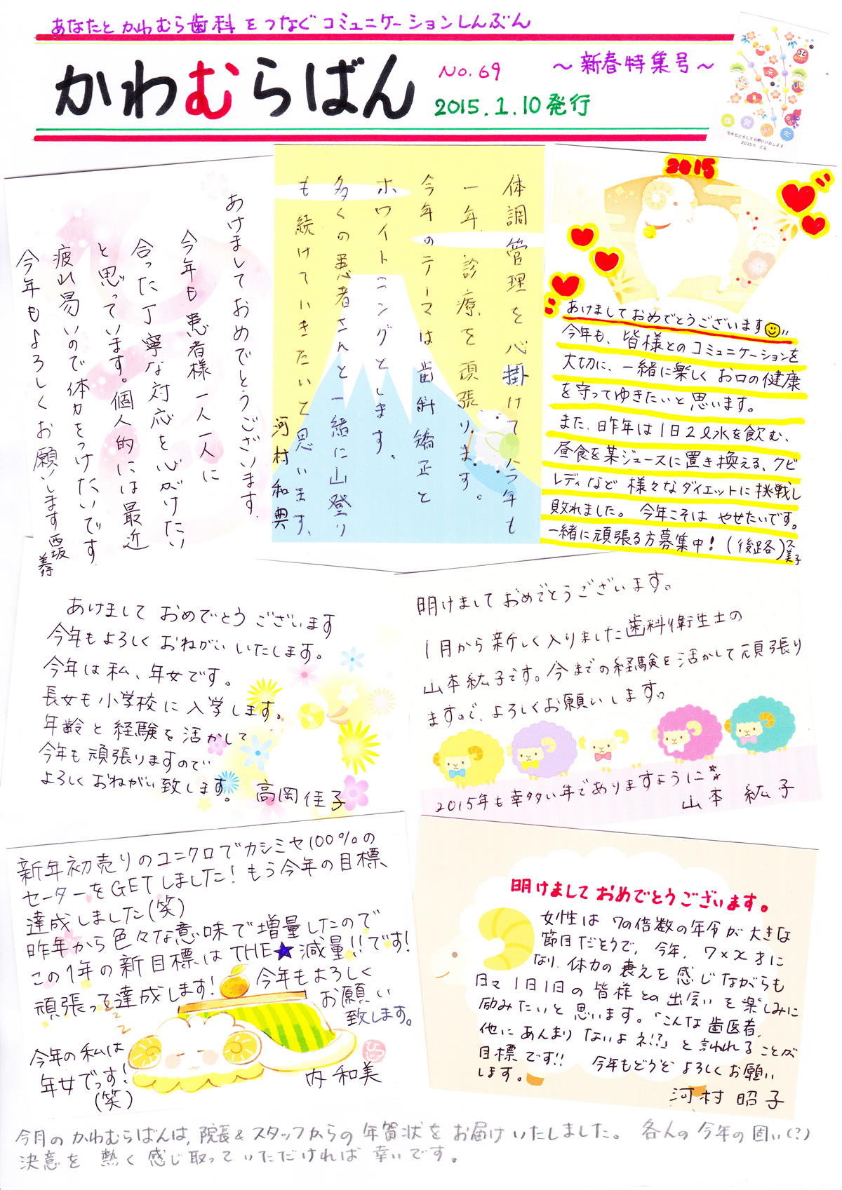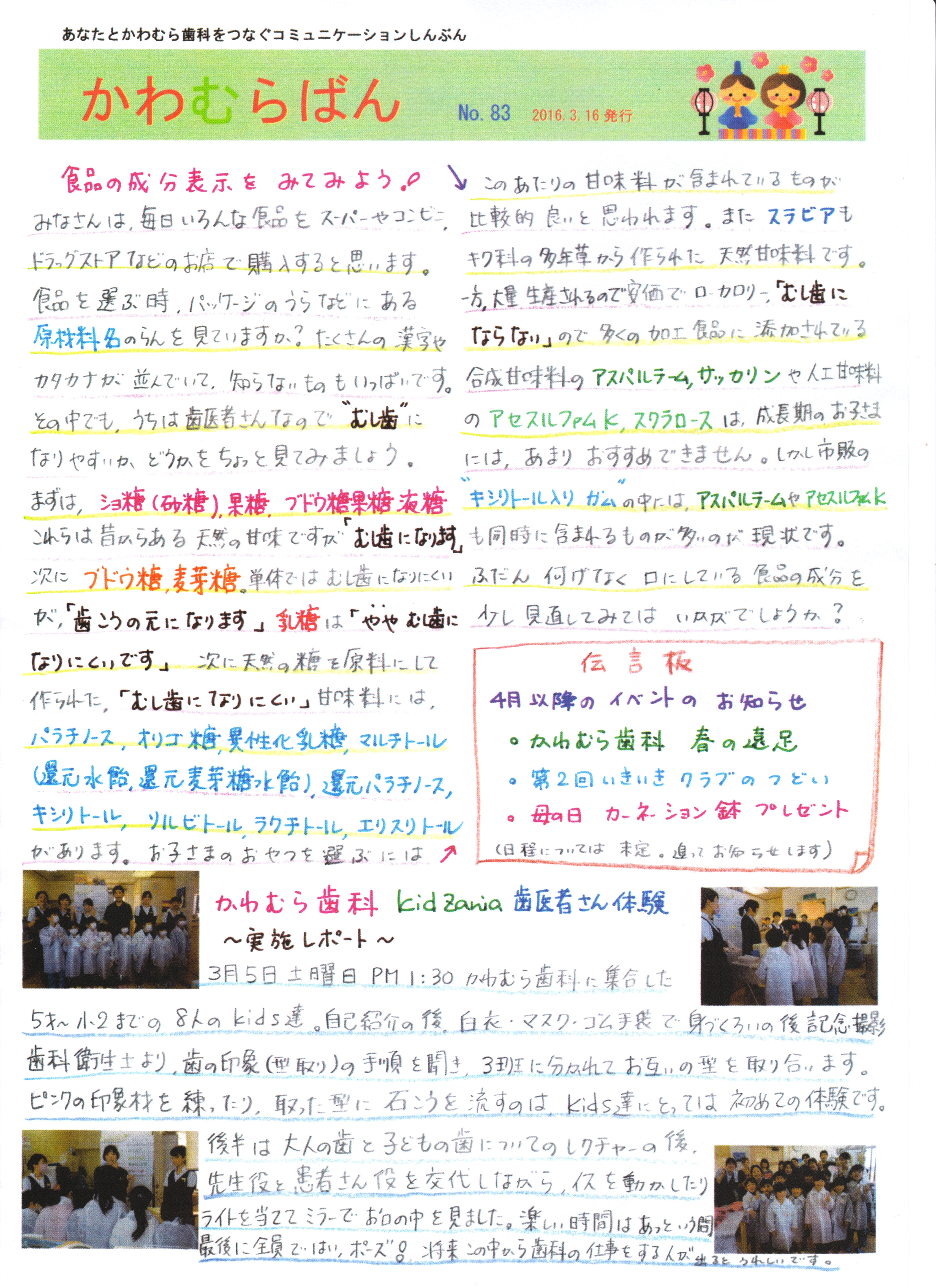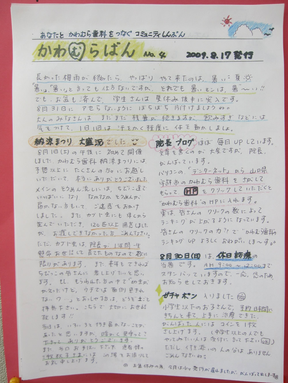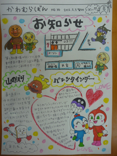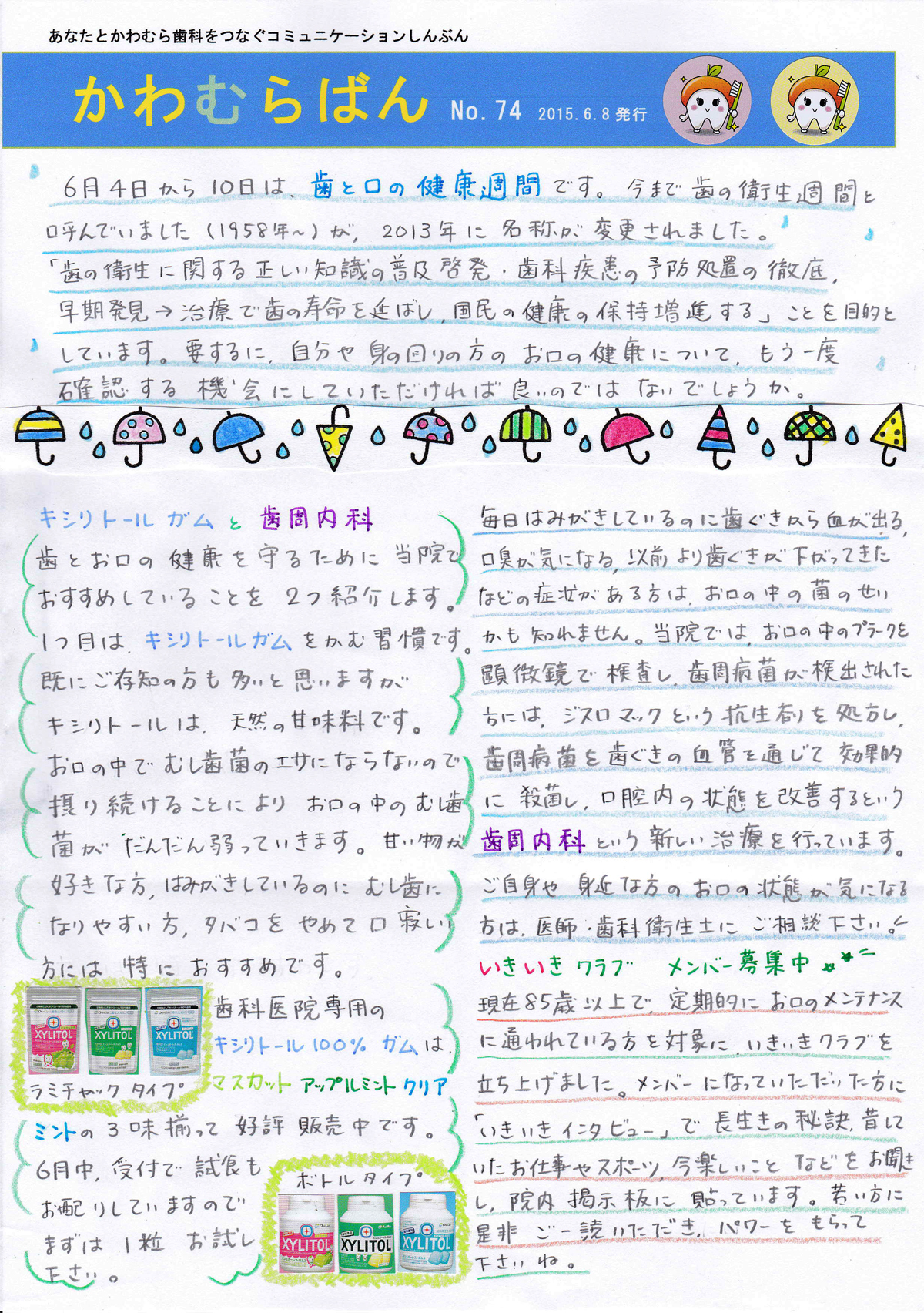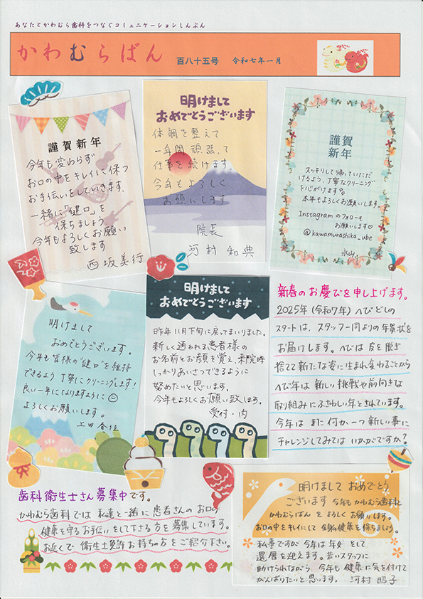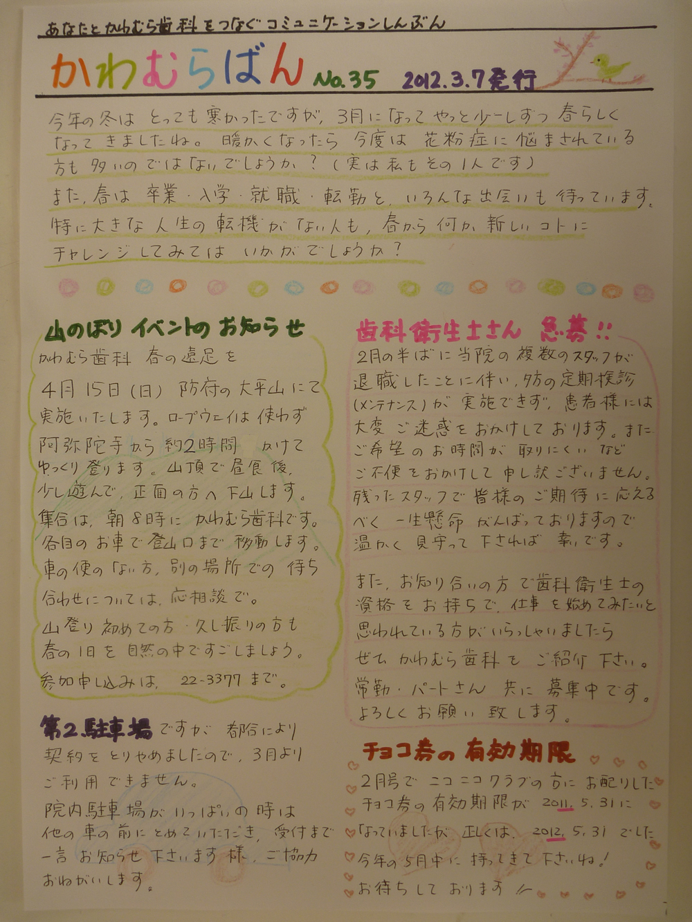 かわむら歯科医院では、院内新聞「かわむら版」を発行しています。 患者さまと医院をつなぐ架け橋として、スタッフが一生懸命に取り組んでいる新聞です。 歯科に関することに限らず、当院の様子、院長の近況など、幅広く、皆様に情報を発信させて頂きたいと思います。 ご意見など、お待ちしております。 毎号ともホームページでもご案内していきますので、是非ご覧下さい。