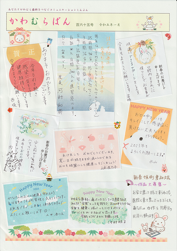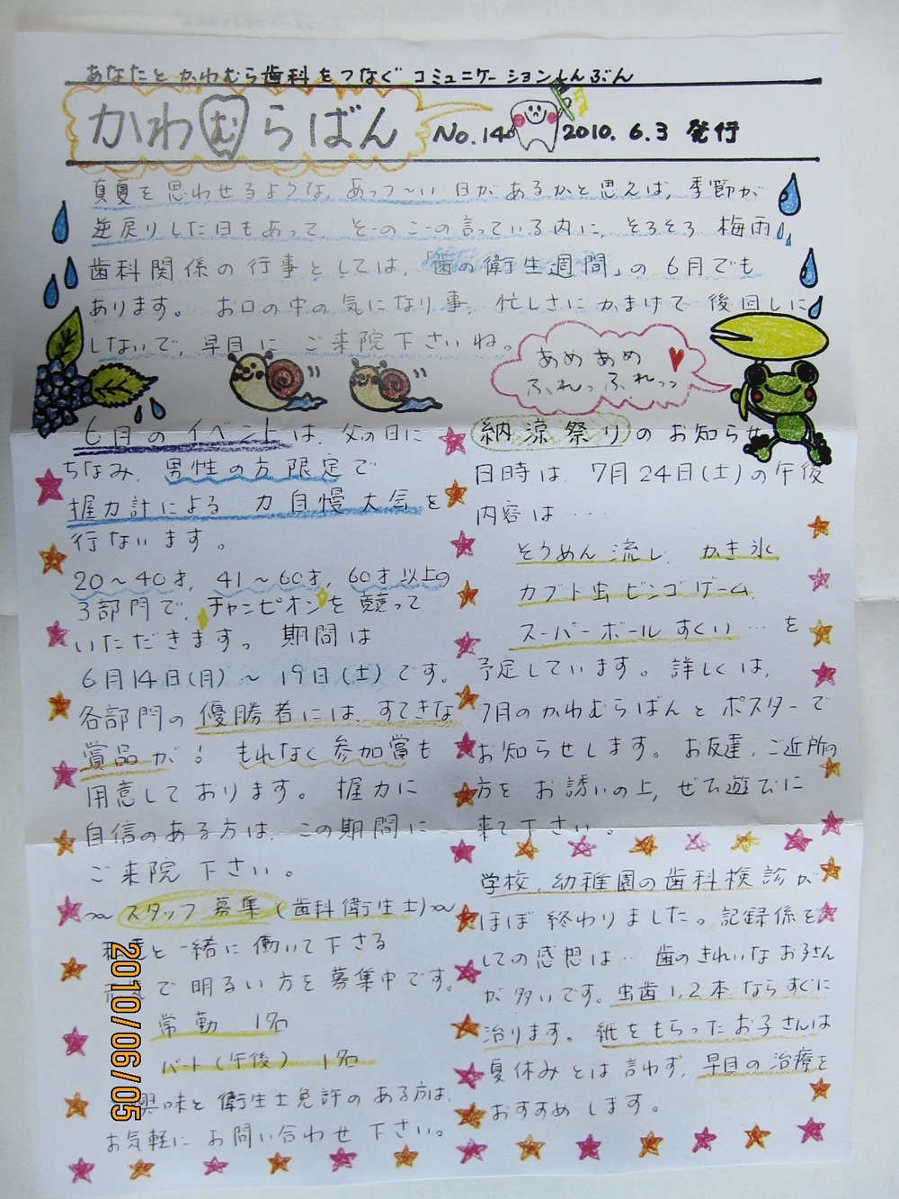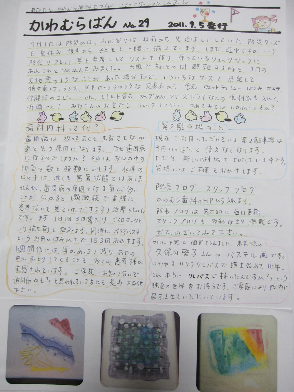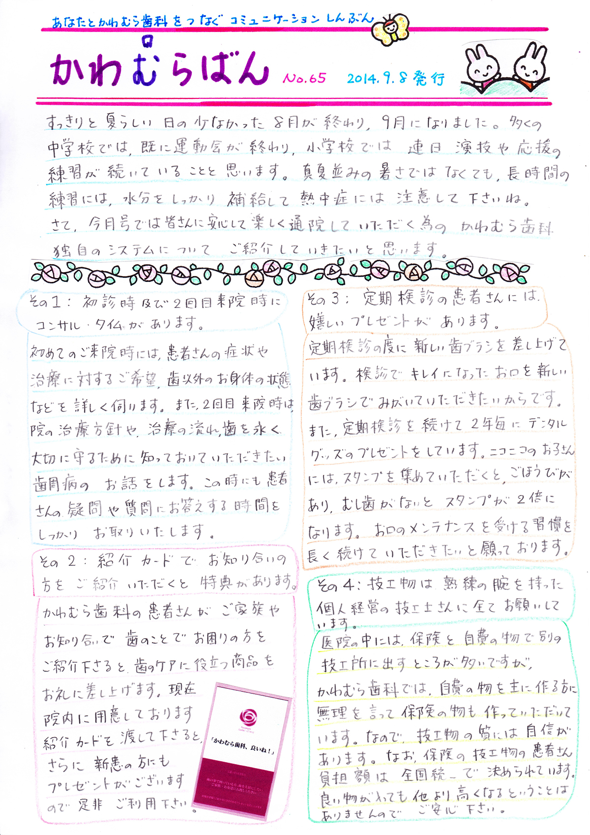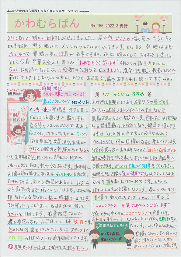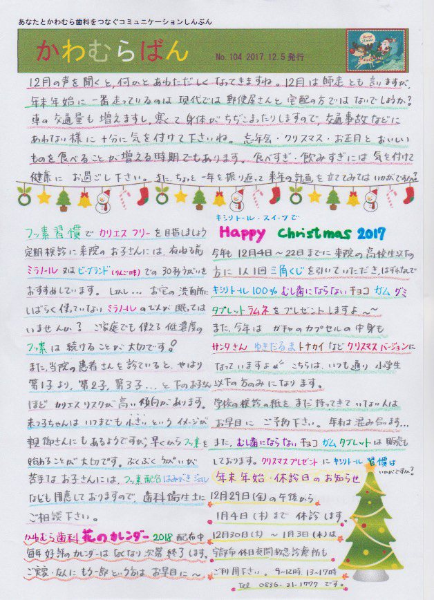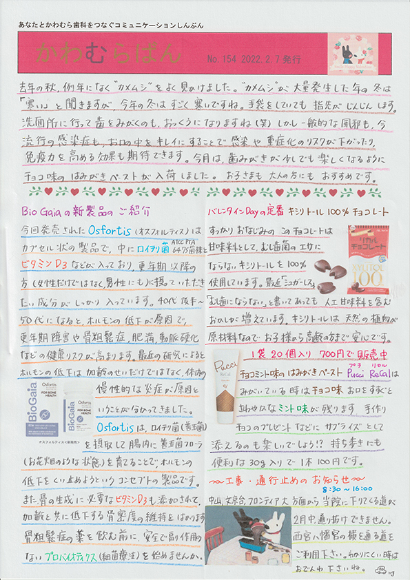 かわむら歯科医院では、院内新聞「かわむら版」を発行しています。 患者さまと医院をつなぐ架け橋として、スタッフが一生懸命に取り組んでいる新聞です。 歯科に関することに限らず、当院の様子、院長の近況など、幅広く、皆様に情報を発信させて頂きたいと思います。 ご意見など、お待ちしております。 毎号ともホームページでもご案内していきますので、是非ご覧下さい。