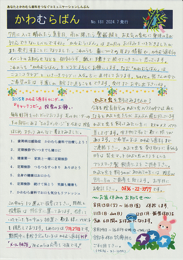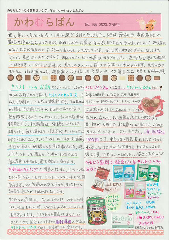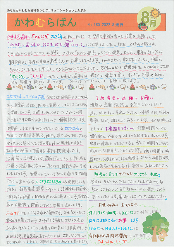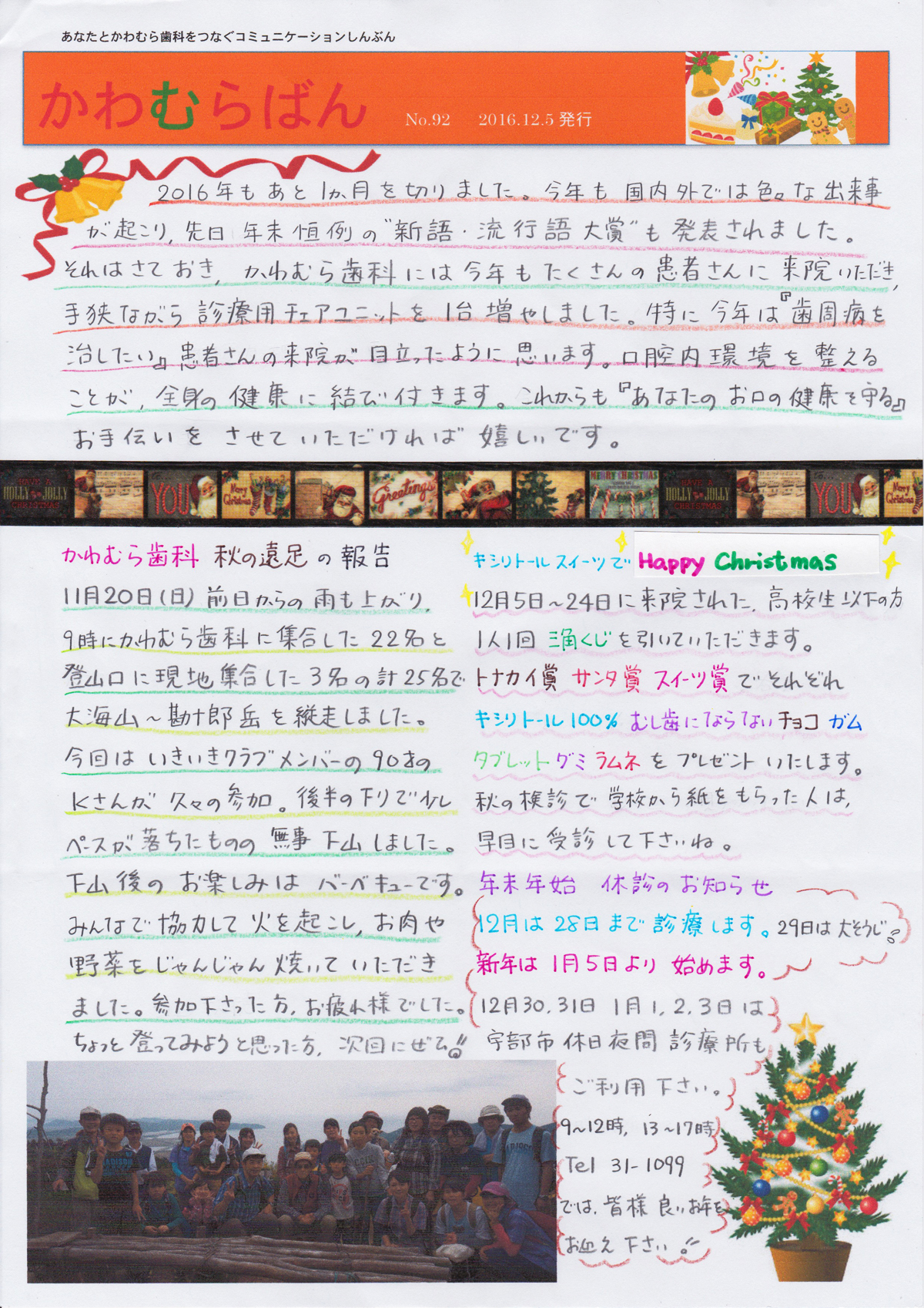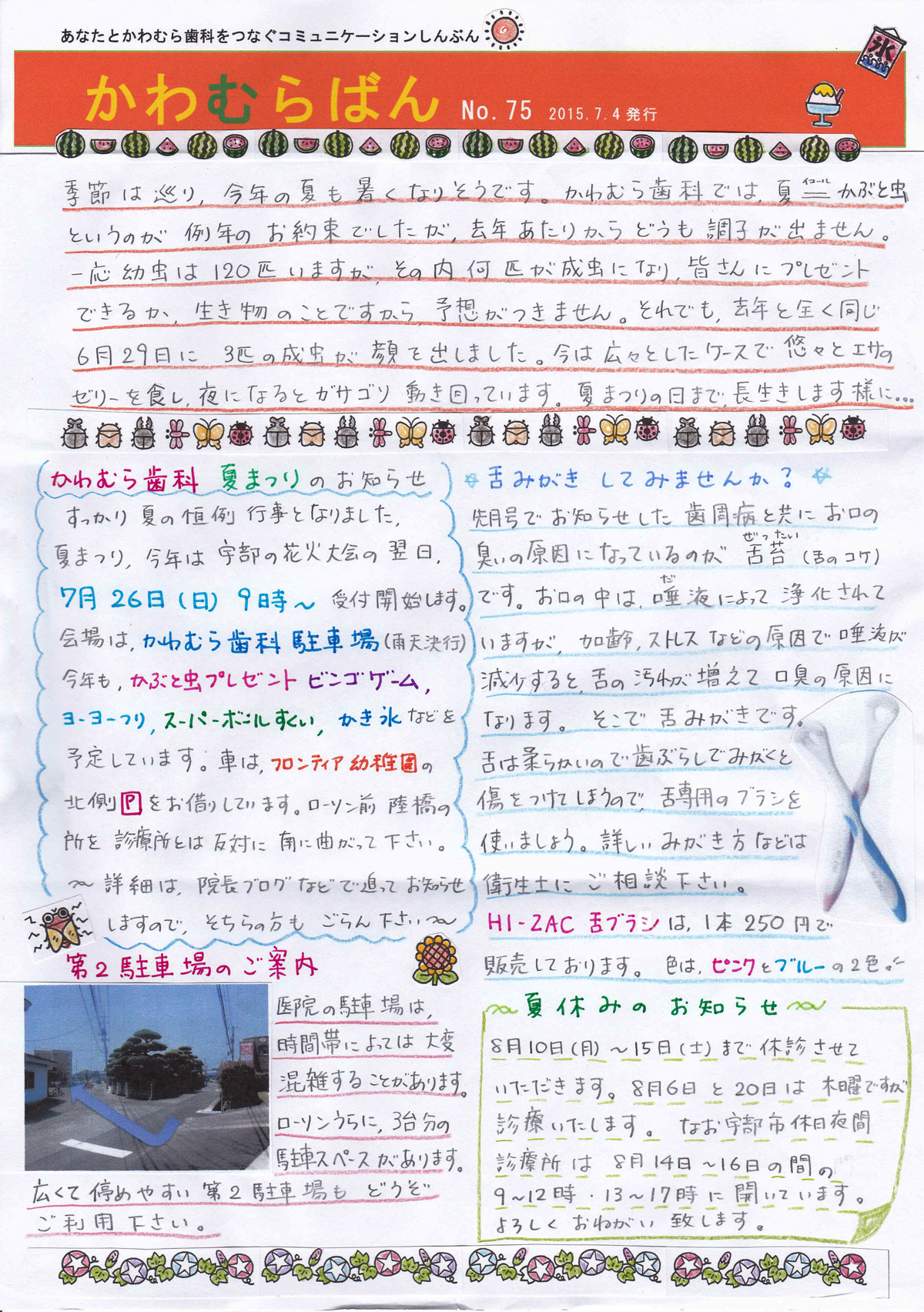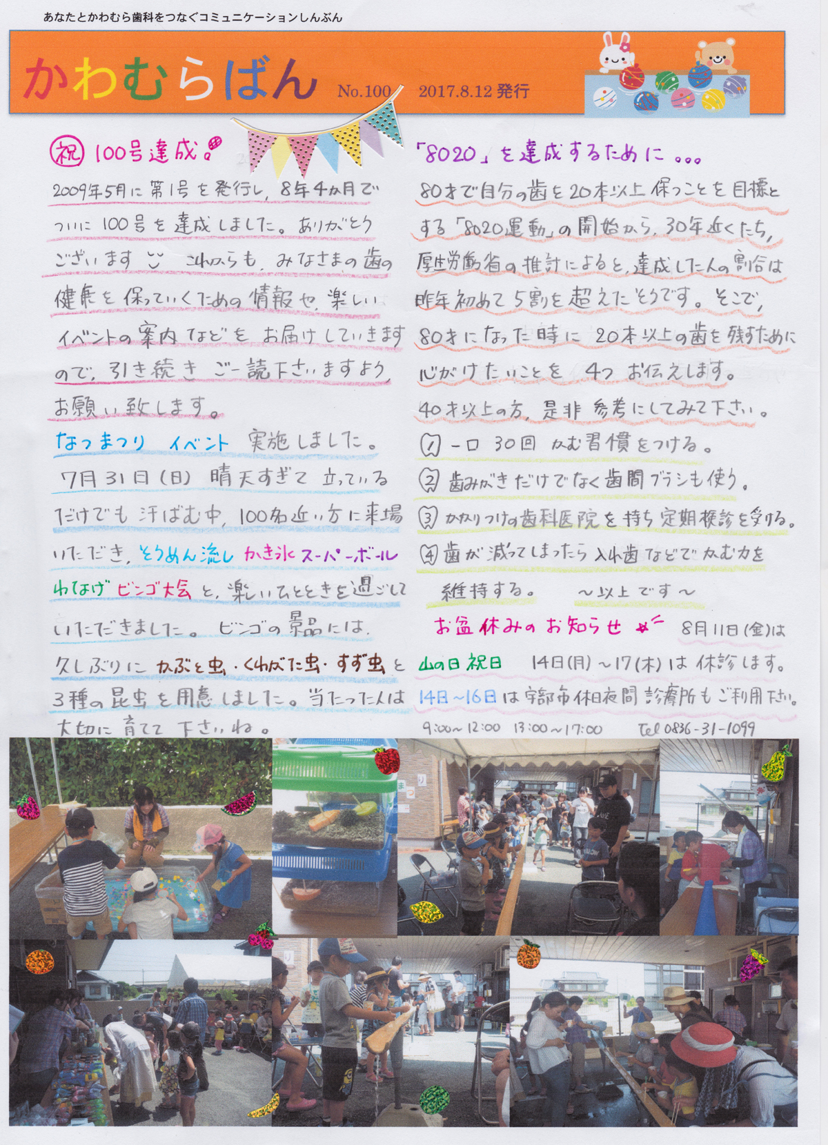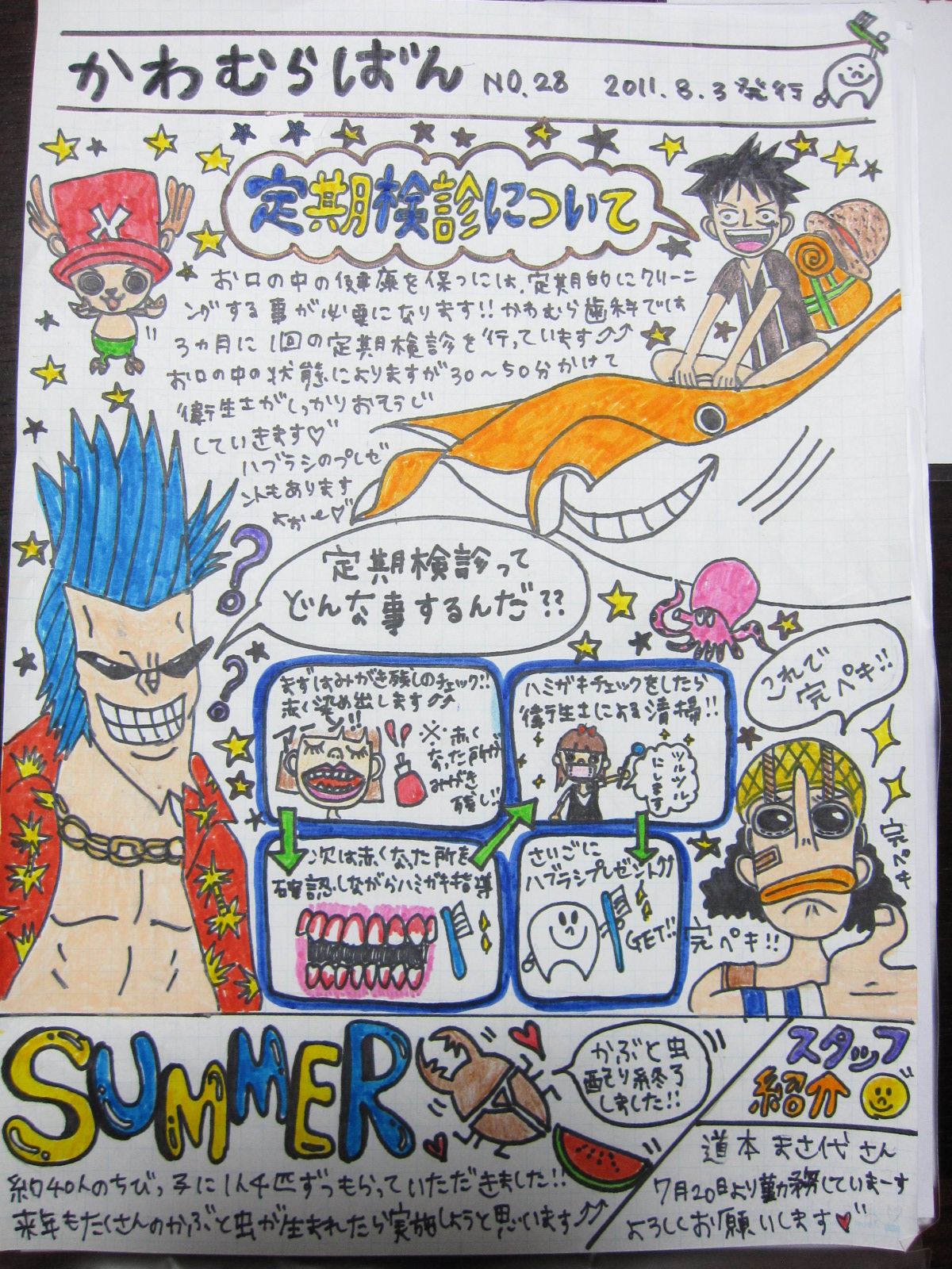 かわむら歯科医院では、院内新聞「かわむら版」を発行しています。 患者さまと医院をつなぐ架け橋として、スタッフが一生懸命に取り組んでいる新聞です。 歯科に関することに限らず、当院の様子、院長の近況など、幅広く、皆様に情報を発信させて頂きたいと思います。 ご意見など、お待ちしております。 毎号ともホームページでもご案内していきますので、是非ご覧下さい。