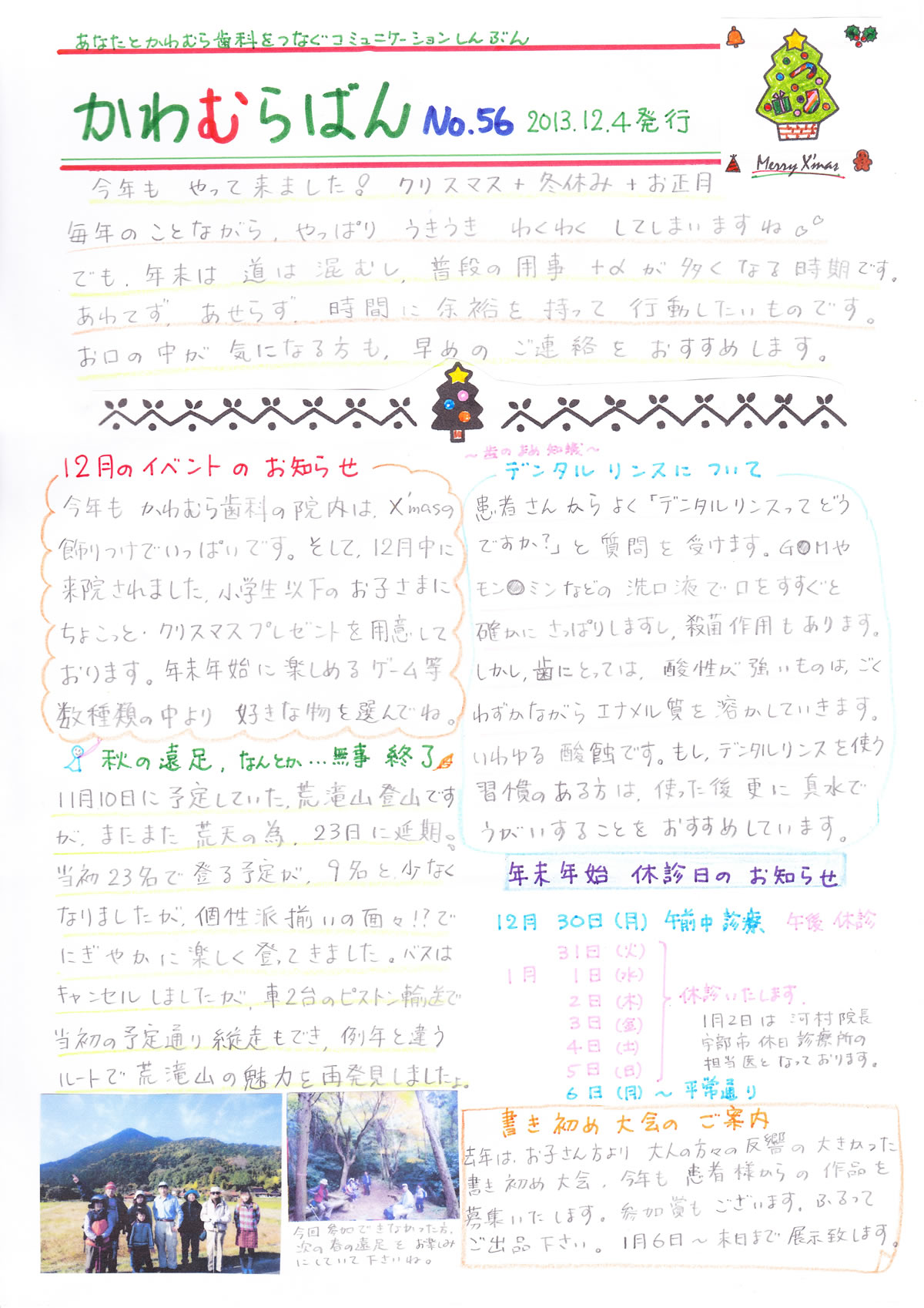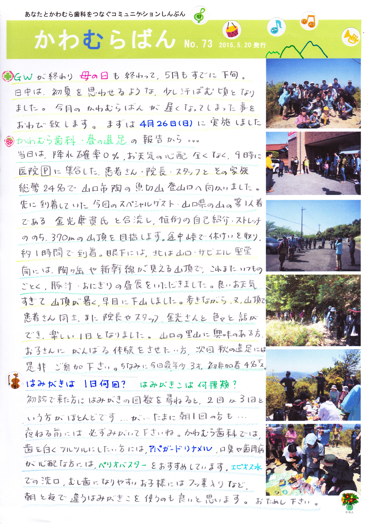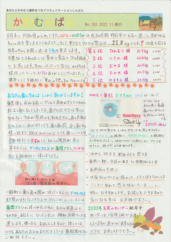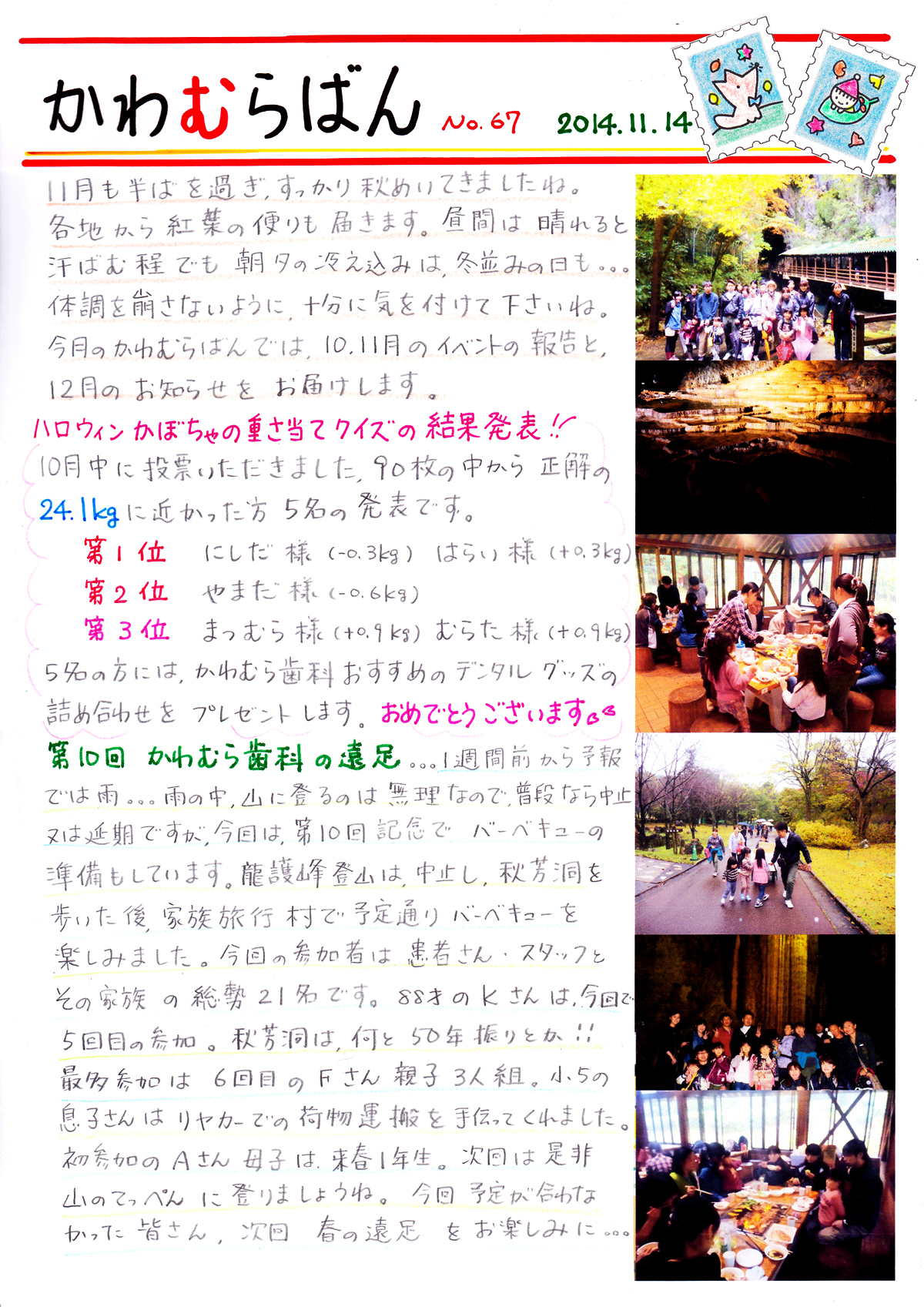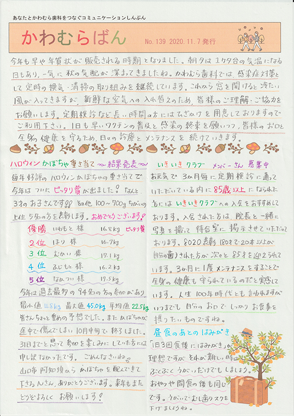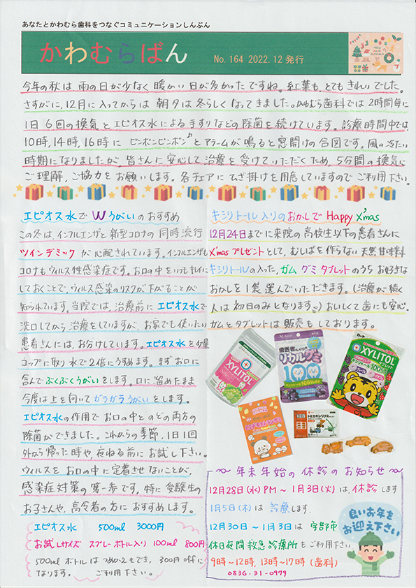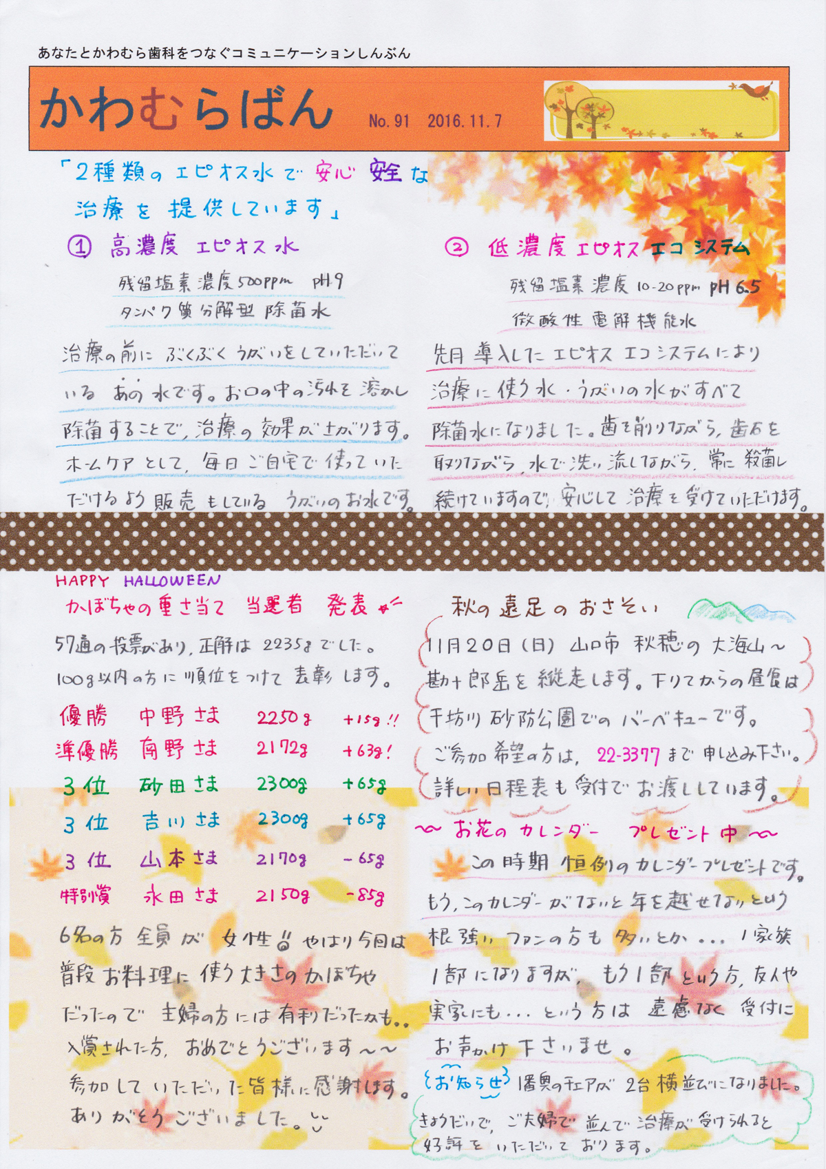 かわむら歯科医院では、院内新聞「かわむら版」を発行しています。 患者さまと医院をつなぐ架け橋として、スタッフが一生懸命に取り組んでいる新聞です。 歯科に関することに限らず、当院の様子、院長の近況など、幅広く、皆様に情報を発信させて頂きたいと思います。 ご意見など、お待ちしております。 毎号ともホームページでもご案内していきますので、是非ご覧下さい。