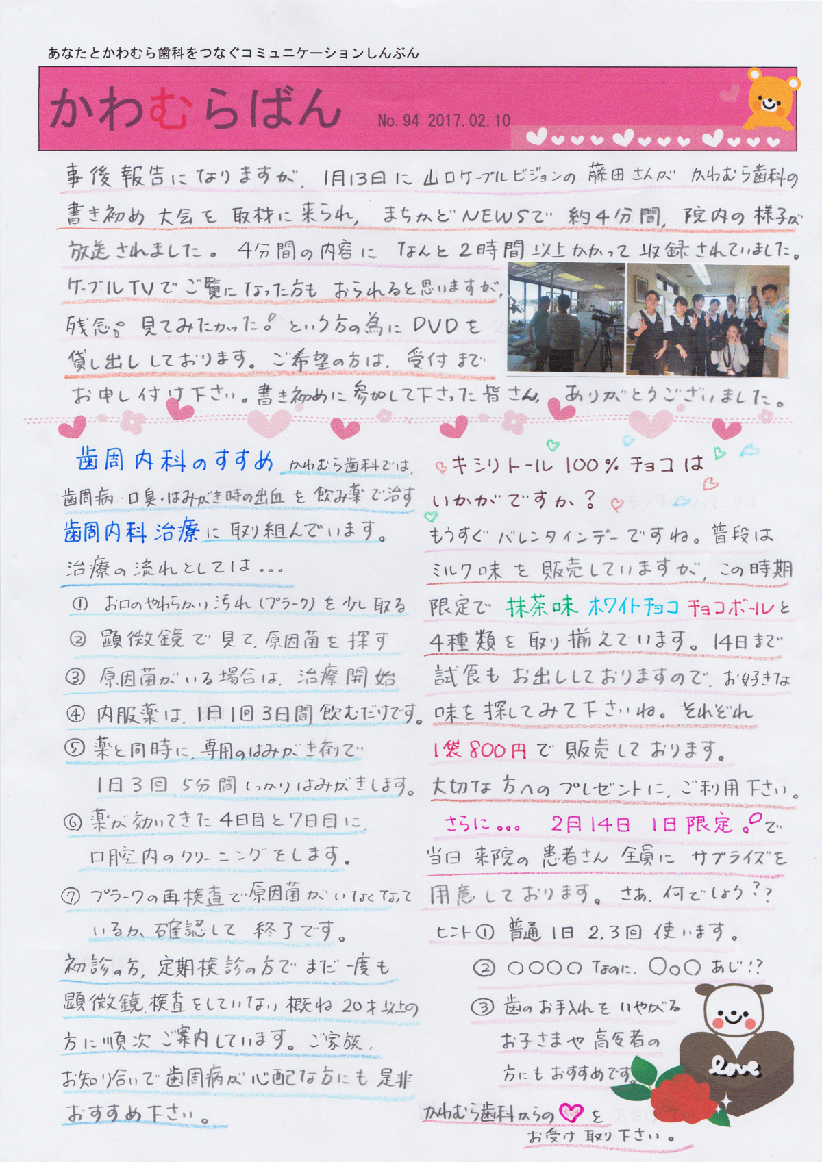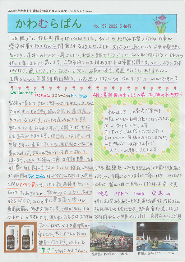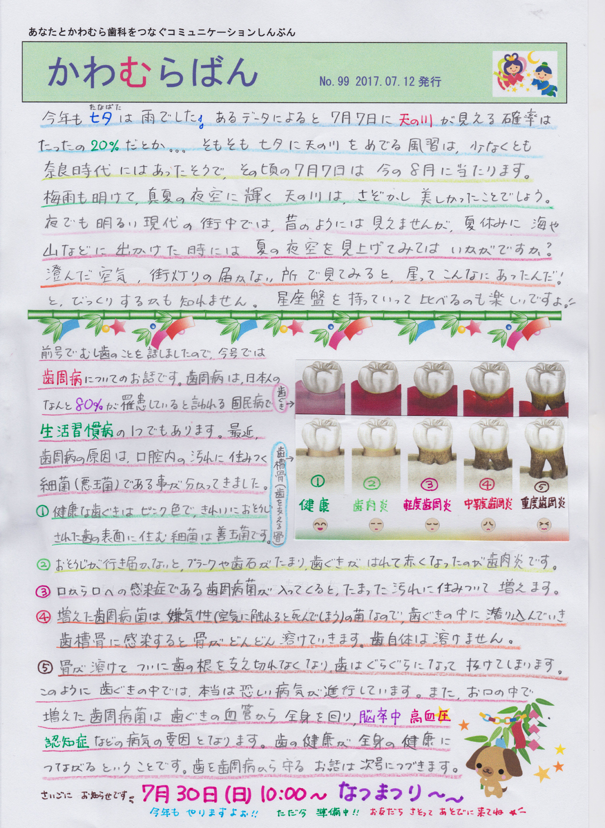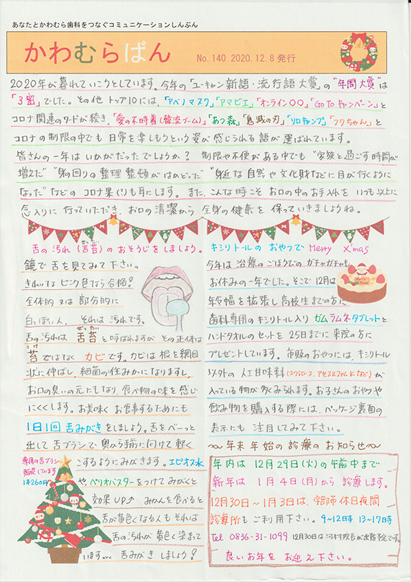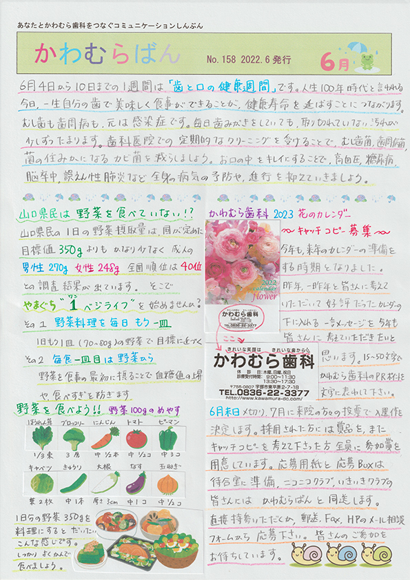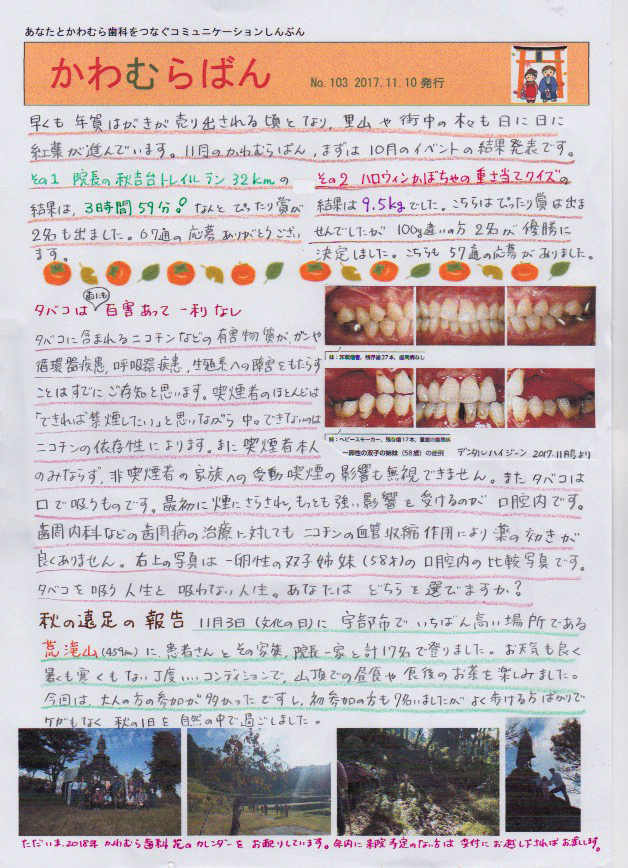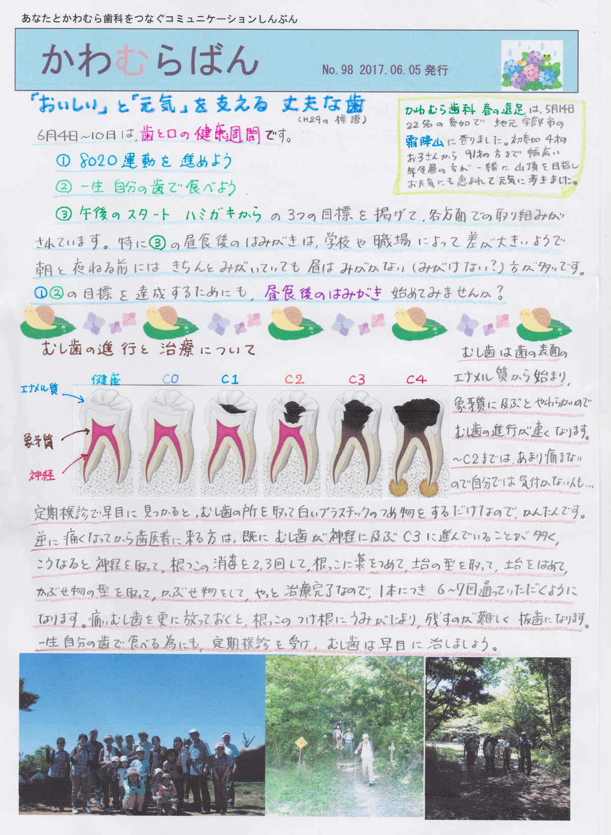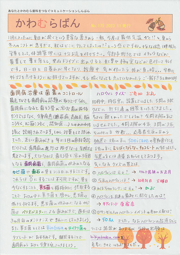 かわむら歯科医院では、院内新聞「かわむら版」を発行しています。 患者さまと医院をつなぐ架け橋として、スタッフが一生懸命に取り組んでいる新聞です。 歯科に関することに限らず、当院の様子、院長の近況など、幅広く、皆様に情報を発信させて頂きたいと思います。 ご意見など、お待ちしております。 毎号ともホームページでもご案内していきますので、是非ご覧下さい。
