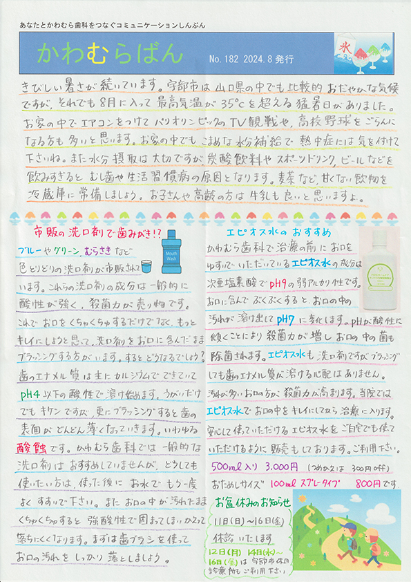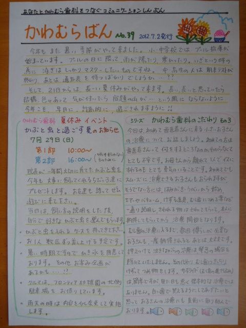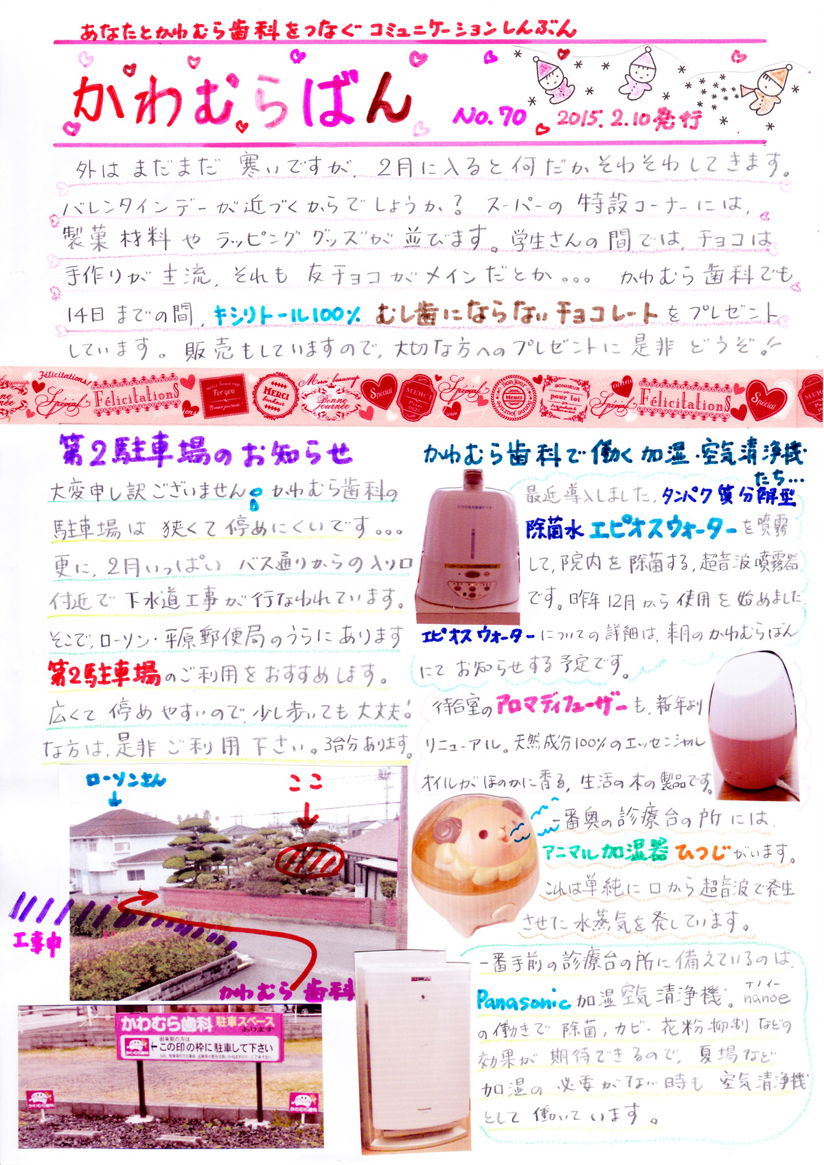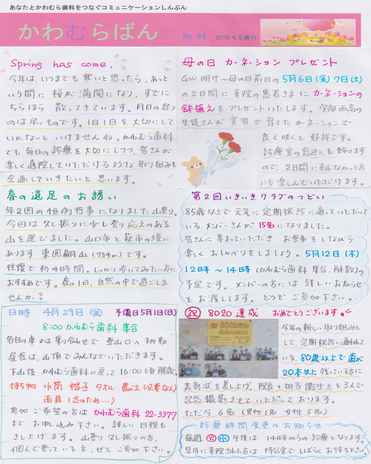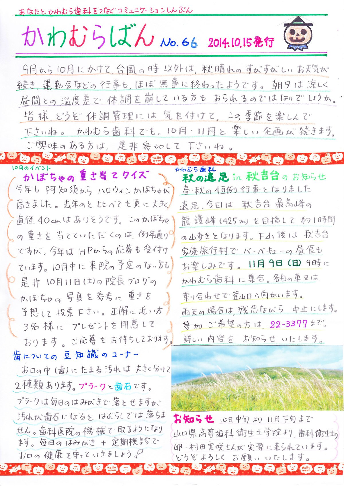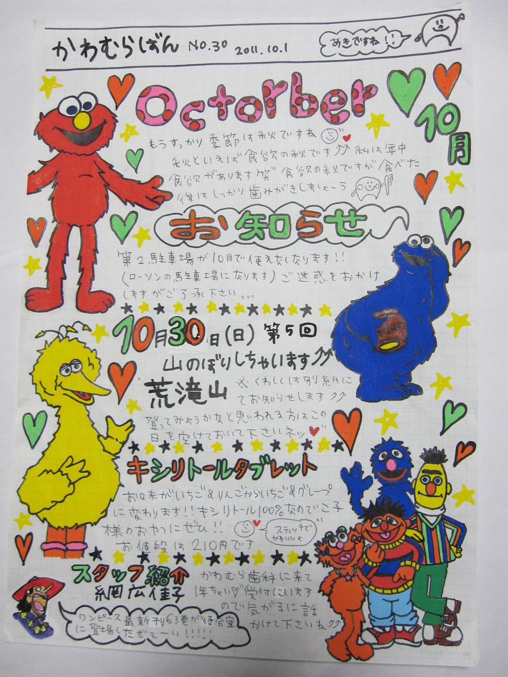 かわむら歯科医院では、院内新聞「かわむら版」を発行しています。 患者さまと医院をつなぐ架け橋として、スタッフが一生懸命に取り組んでいる新聞です。 歯科に関することに限らず、当院の様子、院長の近況など、幅広く、皆様に情報を発信させて頂きたいと思います。 ご意見など、お待ちしております。 毎号ともホームページでもご案内していきますので、是非ご覧下さい。
