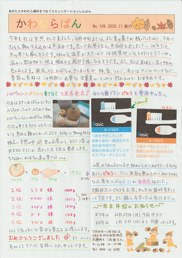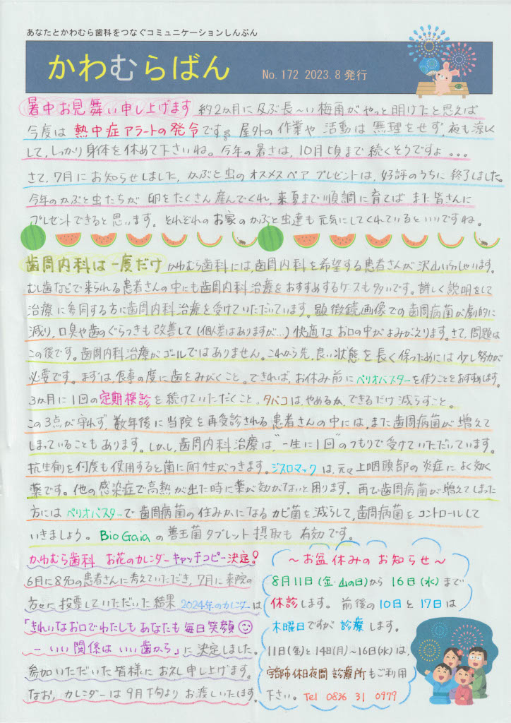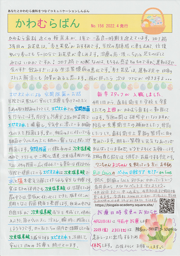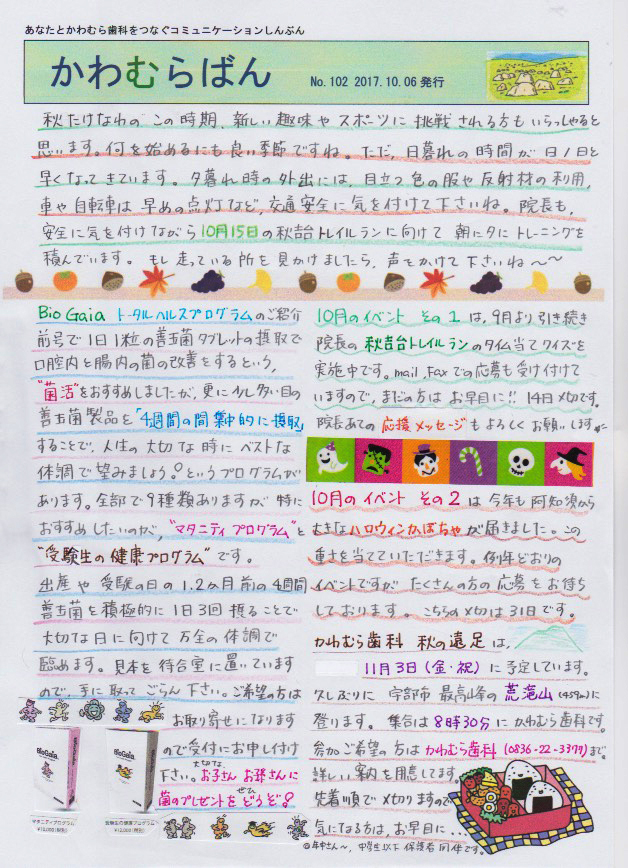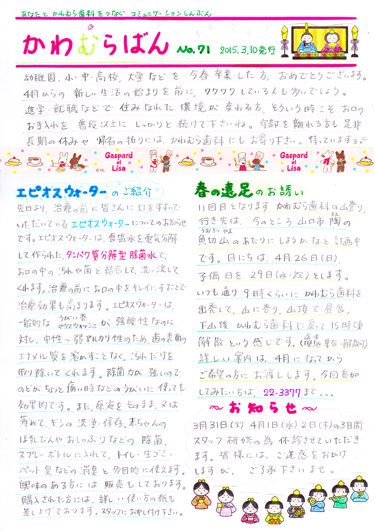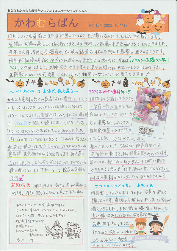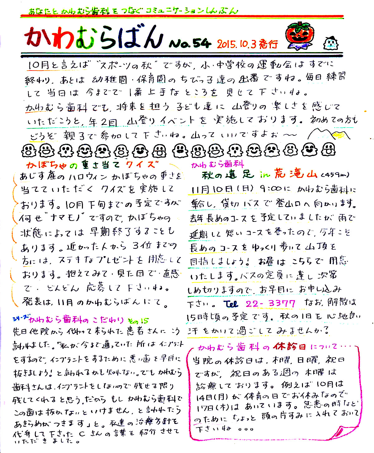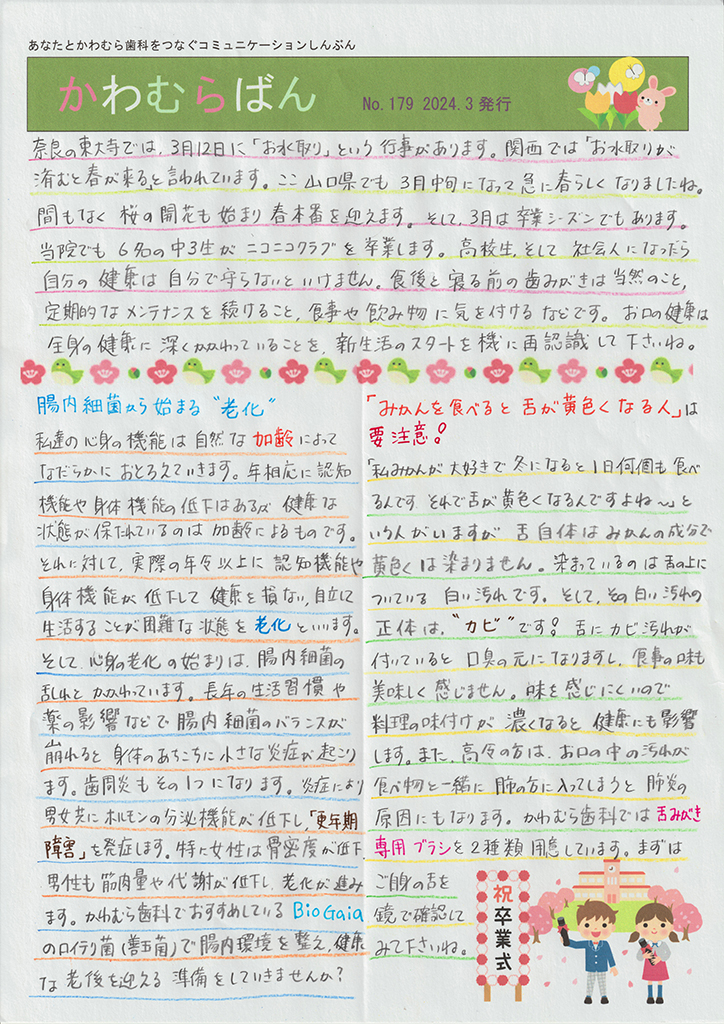 かわむら歯科医院では、院内新聞「かわむら版」を発行しています。 患者さまと医院をつなぐ架け橋として、スタッフが一生懸命に取り組んでいる新聞です。 歯科に関することに限らず、当院の様子、院長の近況など、幅広く、皆様に情報を発信させて頂きたいと思います。 ご意見など、お待ちしております。 毎号ともホームページでもご案内していきますので、是非ご覧下さい。