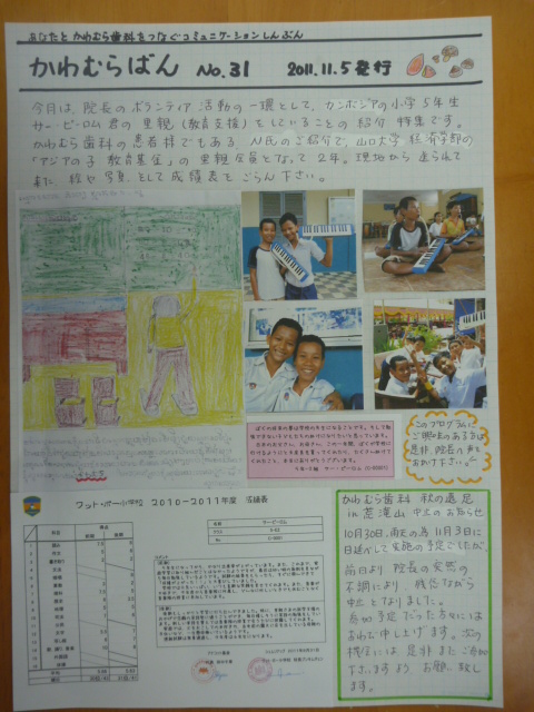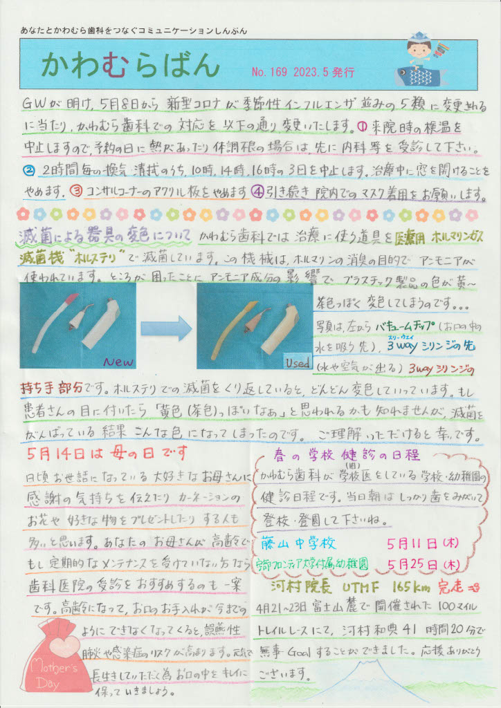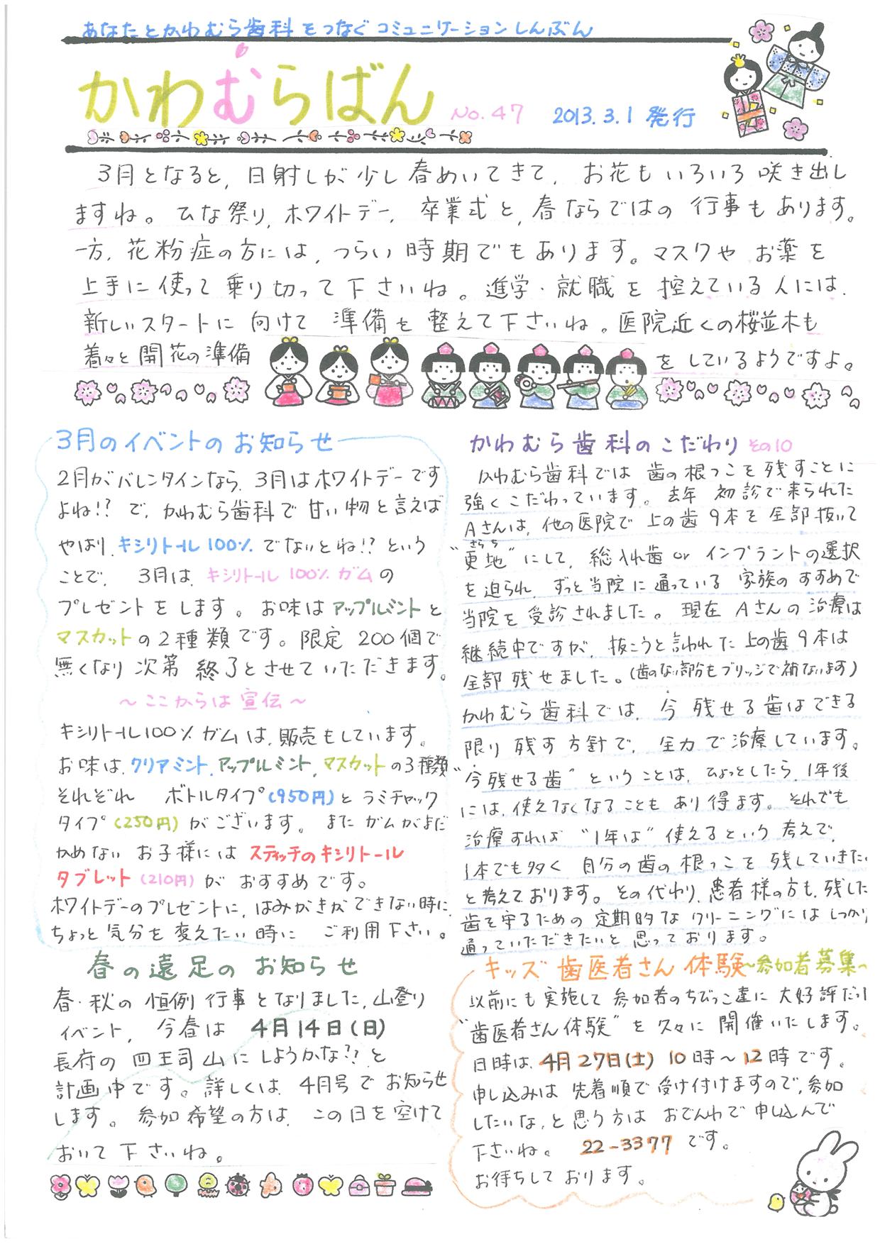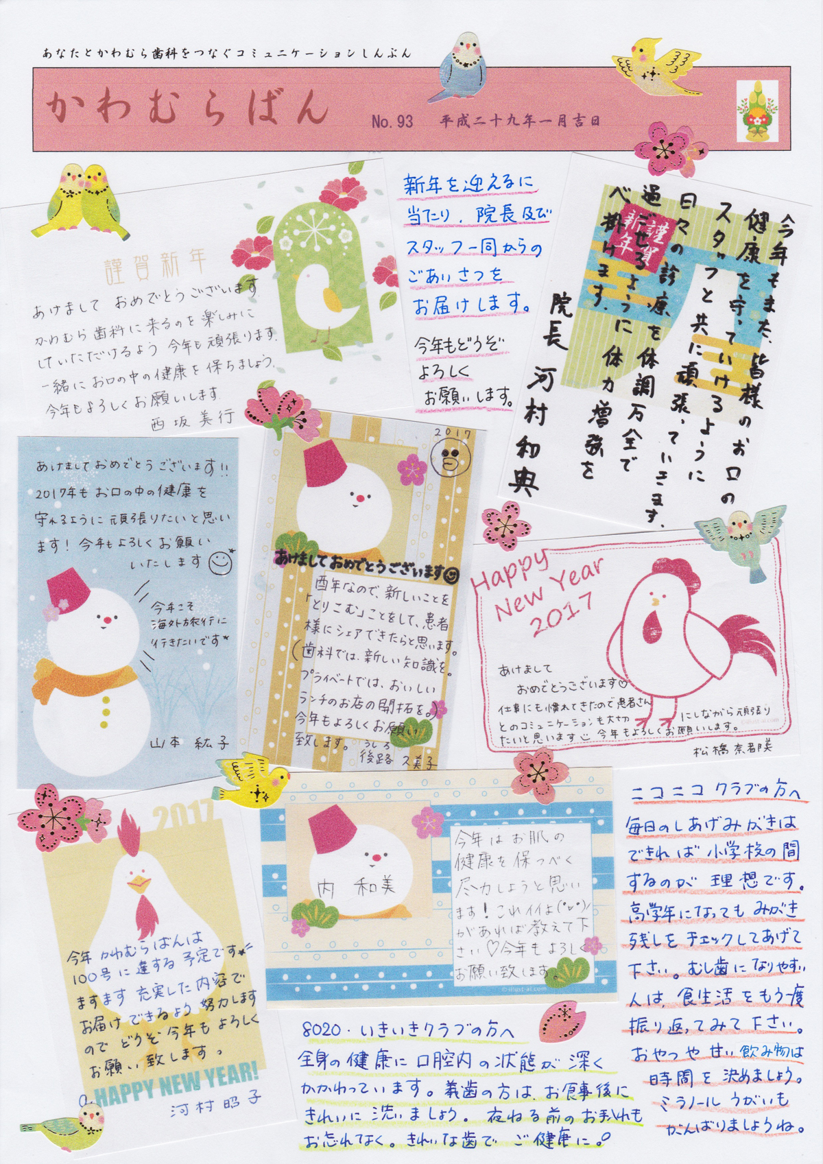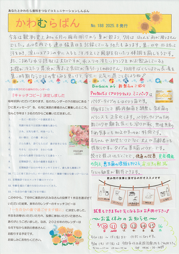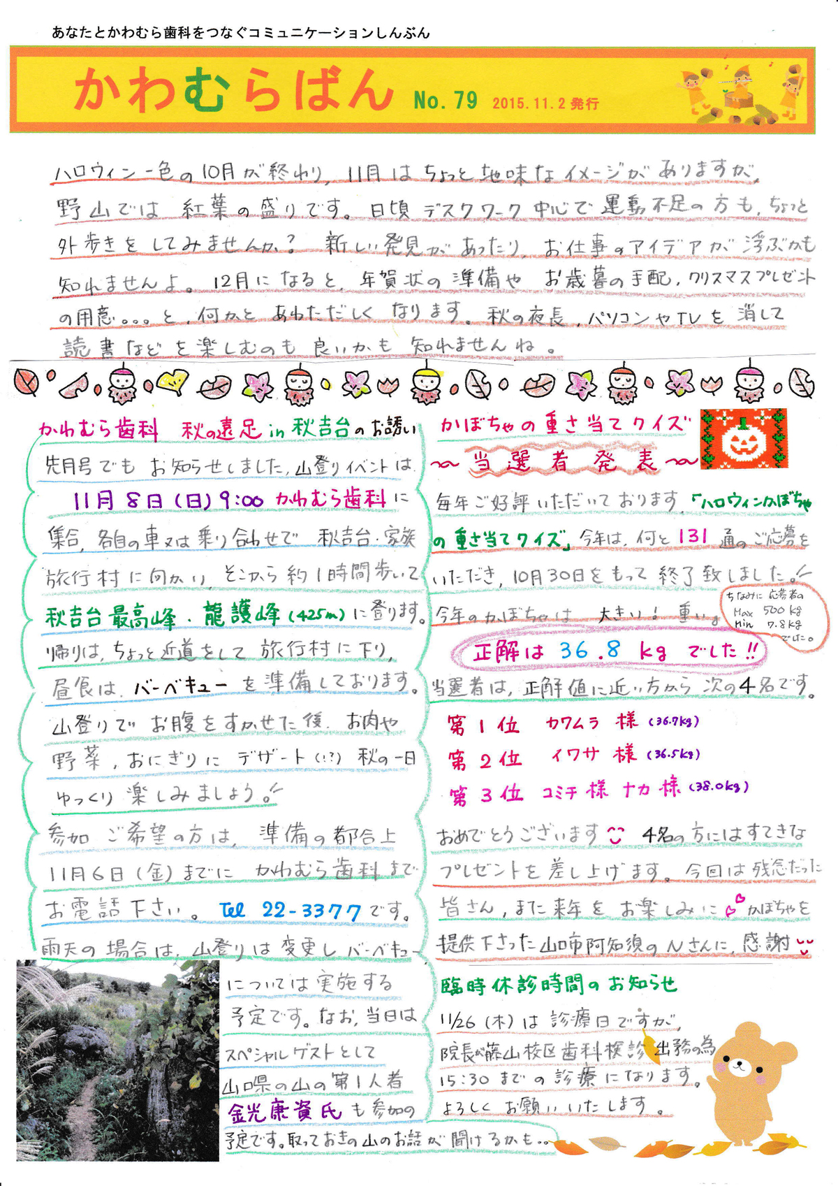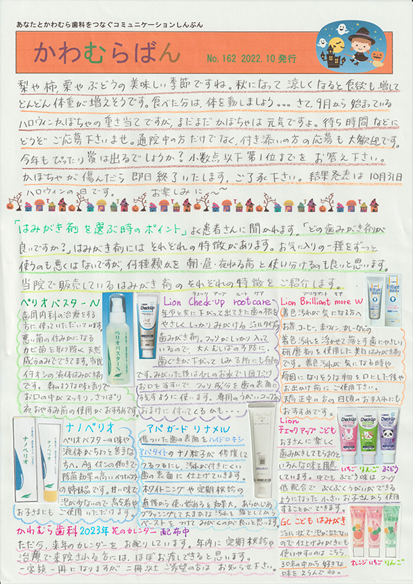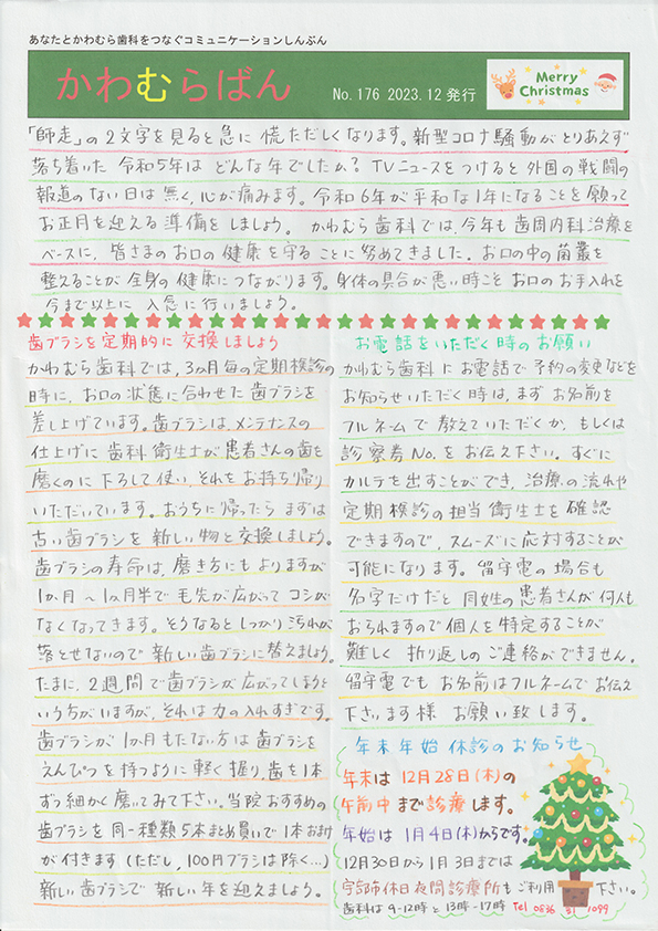 かわむら歯科医院では、院内新聞「かわむら版」を発行しています。 患者さまと医院をつなぐ架け橋として、スタッフが一生懸命に取り組んでいる新聞です。 歯科に関することに限らず、当院の様子、院長の近況など、幅広く、皆様に情報を発信させて頂きたいと思います。 ご意見など、お待ちしております。 毎号ともホームページでもご案内していきますので、是非ご覧下さい。